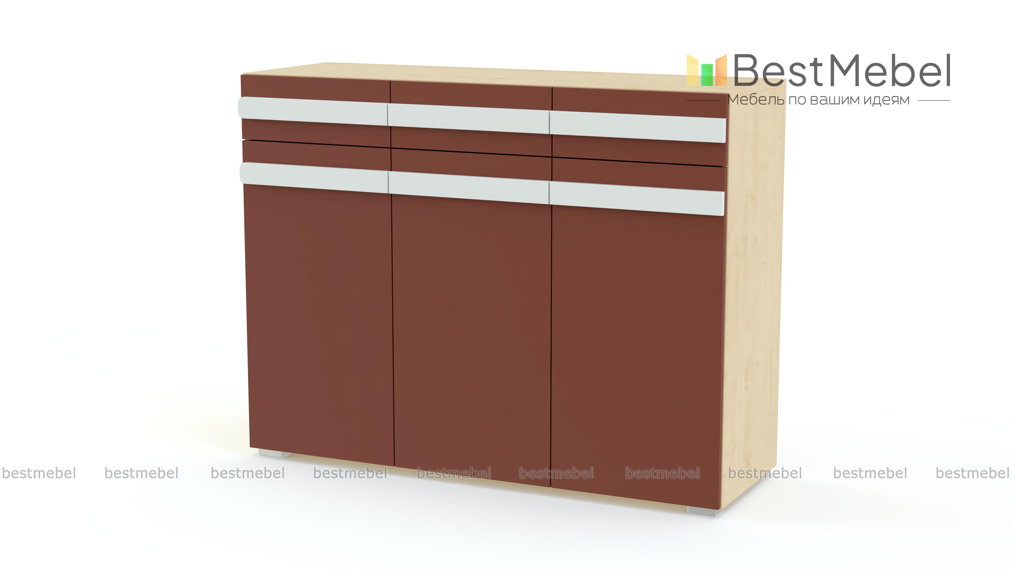 Стильный комод отлично впишется в интерьер современной квартиры или студии. Благодаря компактным размерам он не займет много места, а матовые фасады сделают помещение визуально просторнее. Вместительность модели обеспечивают три выдвижных ящика и распашные отделения с оригинальными ручками, которые позволят разместить постельное белье, предметы гардероба и разнообразные мелочи. На столешнице достаточно места для техники и элементов декора. Комод Дизайн Люкс 9 BMS, выполненный в насыщенных цветах, внесет в атмосферу дома яркие краски и позитив.