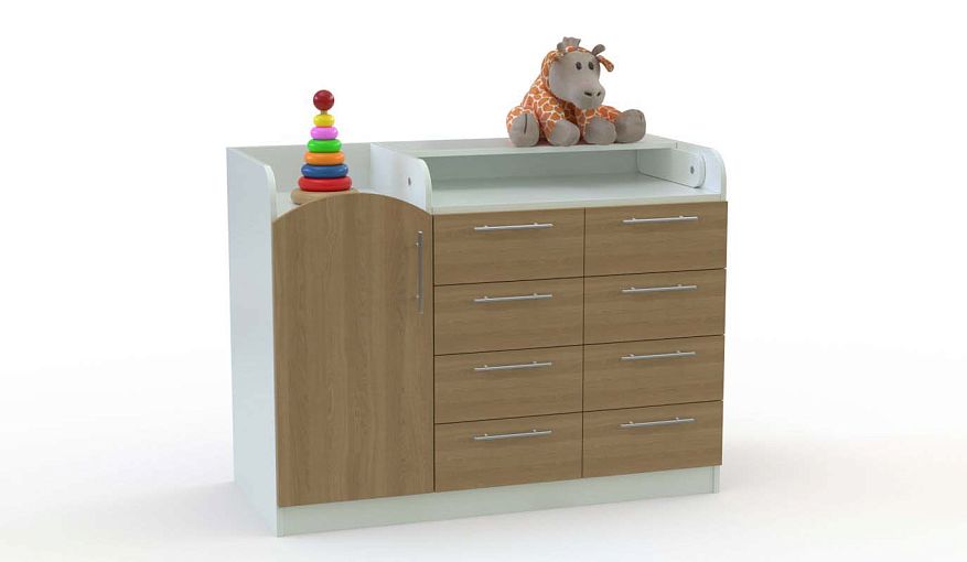Комод Есения Нео 8 BMS удобен для пеленания малыша и хранения его вещей. Широкая модель оборудована восемью выдвижными ящиками и распашным отделением с фигурно вырезанной дверцей. Разделенная на две секции верхняя панель с откидным пеленальным столиком и защитными бортиками позволяет переодевать ребенка, разместив под рукой все необходимые средства гигиены. Купить комод Есения Нео 8 BMS с возможностью выбора цвета и размеров приглашаем в наш интернет-магазин.