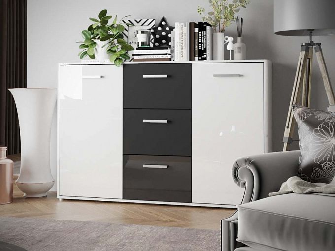 В продолжение модельного ряда Михаил-Люкс был создан современный и многофункциональный комод под №21. Изделие гармонично впишется в просторную спальню, кухню или гостиную. Заказать такой комод можно и в офисное помещение. В наличии 3 секции: центральная представляет собой ряд с 3 выдвижных ящиков, по бокам же находятся симметрично расположенные тумбы с полками за распашными дверями. Контрастное решение цвета базовой модели Вы можете легко поменять при покупке в нашей палитре.