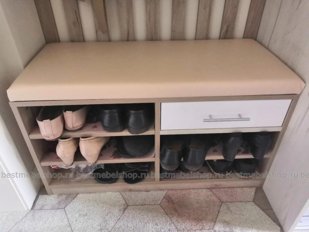 Отличная обувница, сразу мне приглянулась, потому что несколько полочек для обуви, чтобы ничего не мешалось при входе+ удобный ящик для мелочи. На сайте большой выбор материалов и расцветок сидушки. Обувница была частью от заказа в прихожую №00000667194 (Э667194).