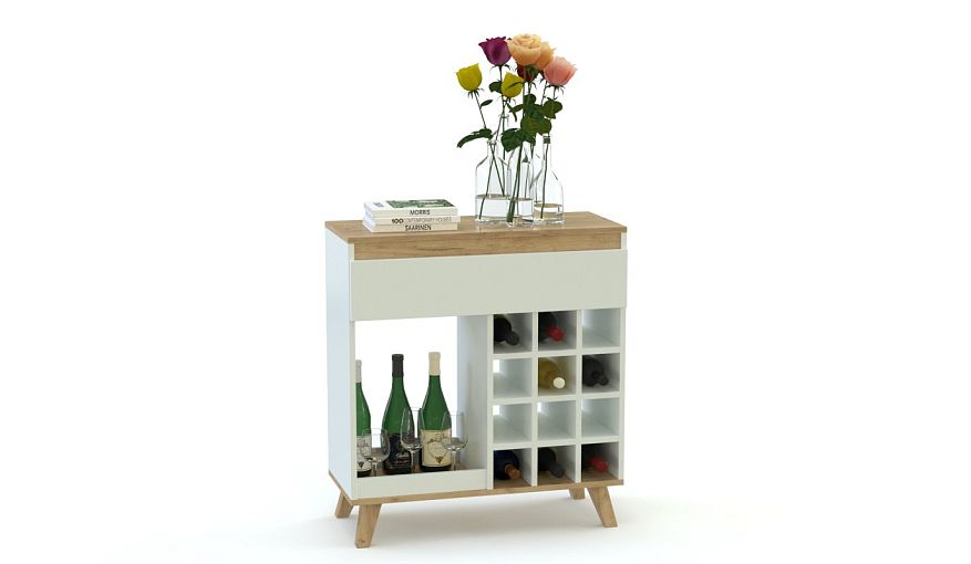 Стеллаж Альфред 7 BMS может использоваться как винная полка, тумба или журнальный столик. Компактная модель на высоких скошенных ножках выполнена в актуальном сочетании крафтовых древесных тонов и белого. Стеллаж оборудован ячейками для горизонтального хранения бутылок с винами, просторной открытой секцией и выдвижным ящиком для мелочей, а дополнительной рабочей поверхностью станет столешница. Купить стеллаж Альфред 7 BMS вы сможете недорого на сайте нашего интернет-магазина.