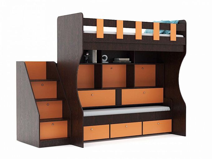Стильная детская двухъярусная кровать Дет-17 BMS – интересный по дизайну вариант для комнаты двоих детей, комфортный в использовании. Верхнее спальное место (габариты 80 х 190 см)с оригинальными защитными бортиками, вторая постель (80 х 180 см) выкатывается из-под столешницы. Лестница, соединяющая ярусы, с широкими ступенями, каждая из которых – отсек для хранения. Удачно реализована учебная зона: стол оборудован секциями и ящиками. Чтобы сложить пижамы, одеяла, текстиль, нужно выдвинуть отделения под основанием выкатной кроватки. Крепкая ЛДСП представлена во множестве оттенков.