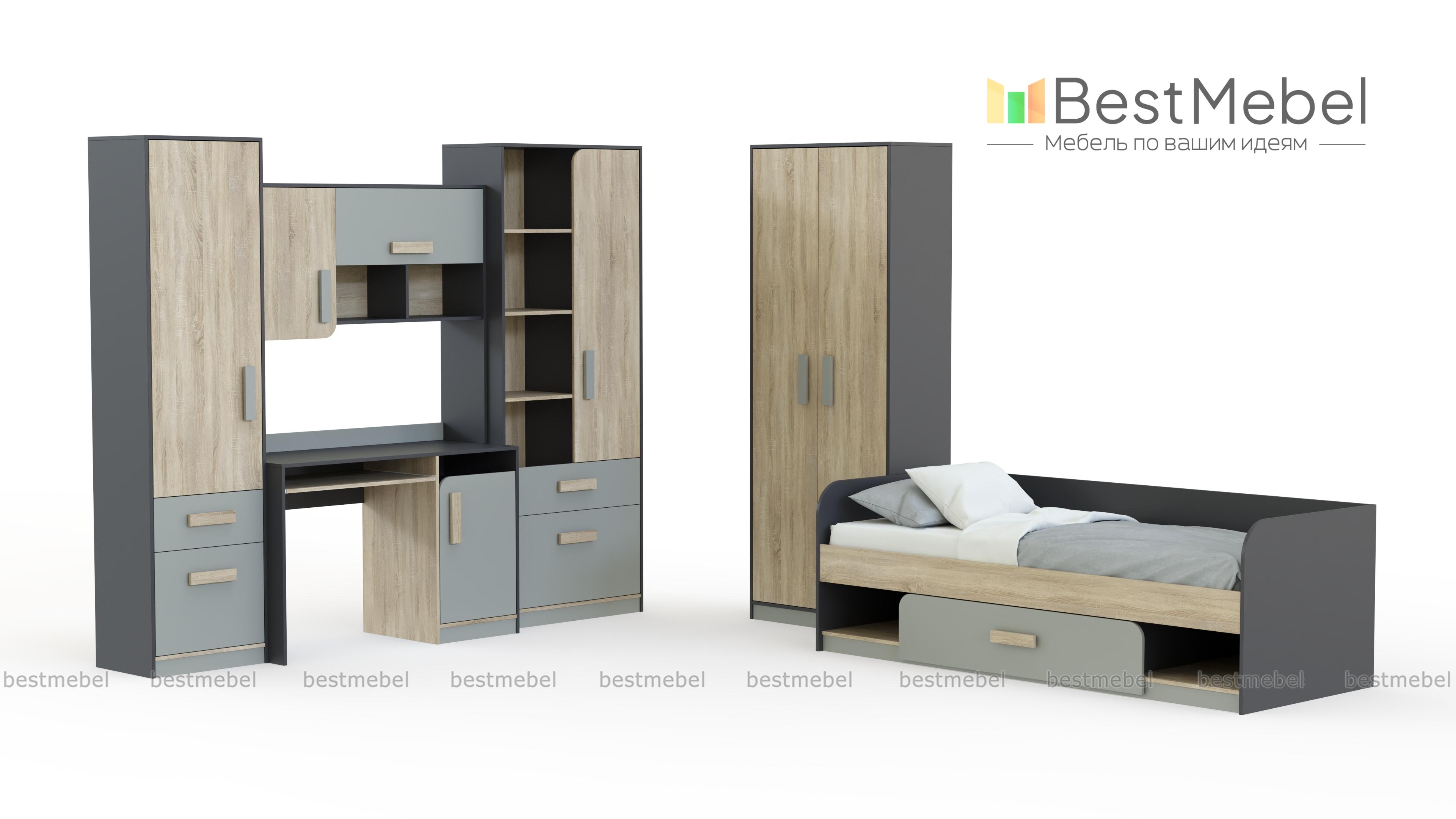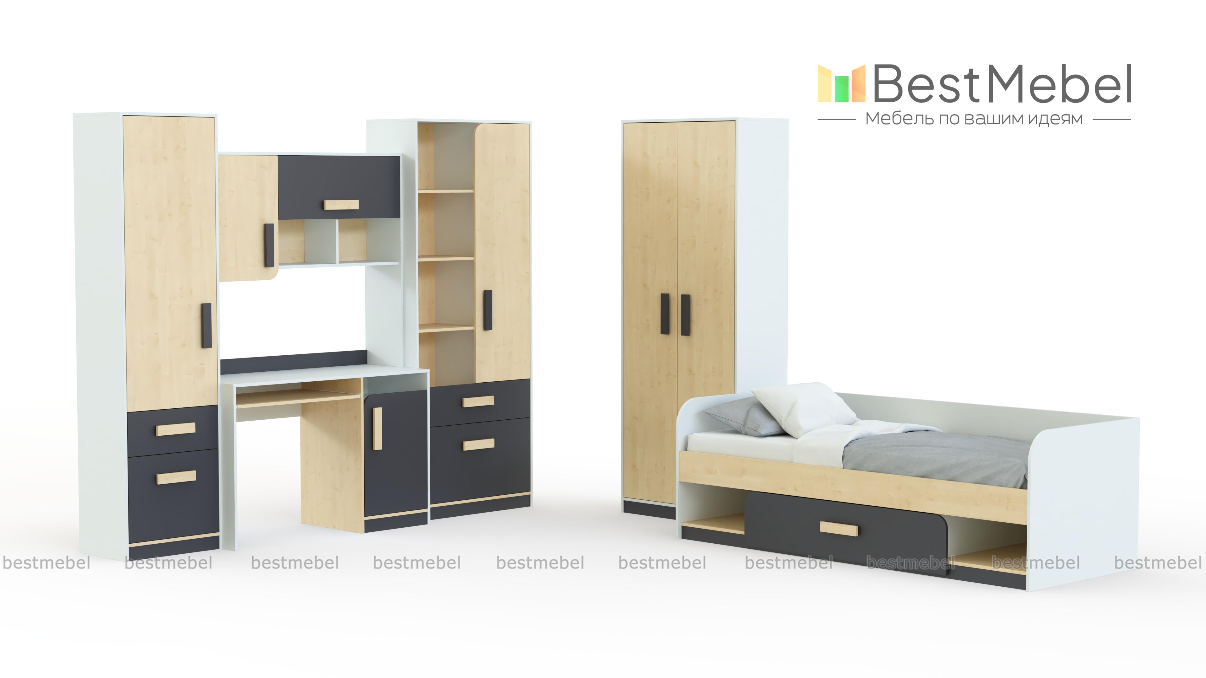 Детская Фантазия BMS – практичный модульный комплект современного яркого дизайна с оригинально закругленными фасадами. В детской учтены все требования к качеству и безопасности материалов, а разнообразие входящих в комплект элементов позволит полностью оборудовать помещение. Стол с выдвижной полкой для клавиатуры и тумбой дополнен навесной полкой, пеналом и комбинированным шкафом для хранения школьных и спортивных принадлежностей. В основании кровати – бельевой ящик и ниши, для одежды предусмотрен просторный двухдверный шкаф. Купить детскую Фантазия BMS вы сможете в нашем интернет-магазине.