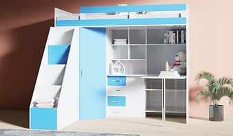 Кровать-чердак с рабочей зоной Мираж К21 BMS – это практичная угловая композиция, которая поможет максимально выгодно использовать доступное пространство. Сочетая в себе современный дизайн и функциональность, модель оборудована просторным спальным местом с защитным бортиком, распашным шкафом для одежды, рабочей зоной с эргономичным столиком, полками и тумбой, а также лестницей комодом с вместительными ящиками для игрушек. Купить кровать-чердак с рабочей зоной Мираж К21 BMS приглашаем к нам в интернет-магазин.