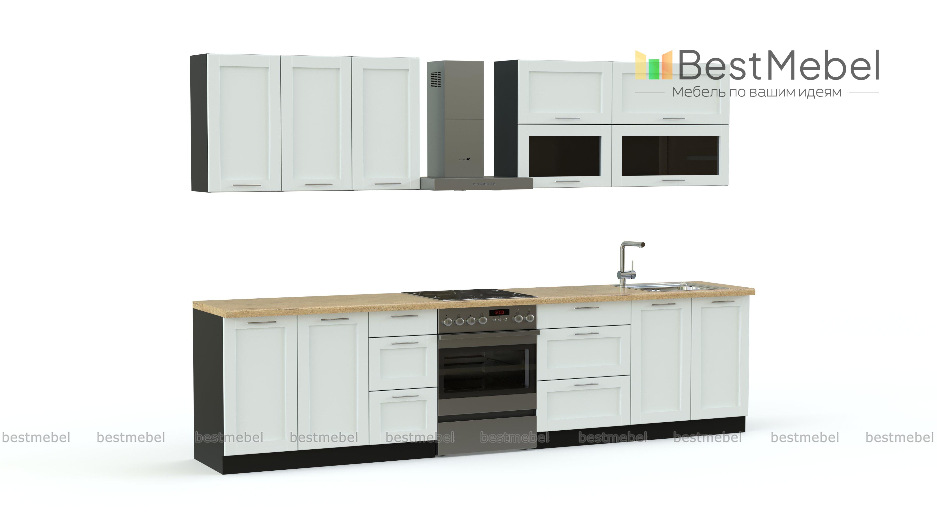 В комплект для современной кухни Экран 2 BMS входит по четыре вместительных модуля в нижней и верхней части. Шкафчики имеют выдвижные, распашные и открывающиеся вверх ящики, отвечающие самым разнообразным нуждам. Выполненные в модном темном оттенке, фасады украшены рамочной фрезеровкой. Они не только практичны и долговечны, но и эффектно смотрятся. Дополняют оригинальный дизайн крупная фурнитура, прозрачные стеклянные дверцы посудных шкафов и устойчивые алюминиевые ножки.