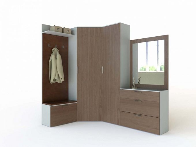 Прихожая Деметра 22 BMS выгодно использует особенности планировки за счет угловой конструкции. Композиция включает в себя распашные шкафы для одежды, комод из трех выдвижных ящиков, навесное зеркало, открытую вешалку и обувницу с мягким сиденьем. Лаконичная по форме, прихожая в сочетании белого и древесных тонов с декоративными вставками в экокоже смотрится актуально и гармонично вписывается в современные интерьеры. Купить прихожую Деметра 22 BMS вы сможете в нашем интернет-магазине по доступной цене.