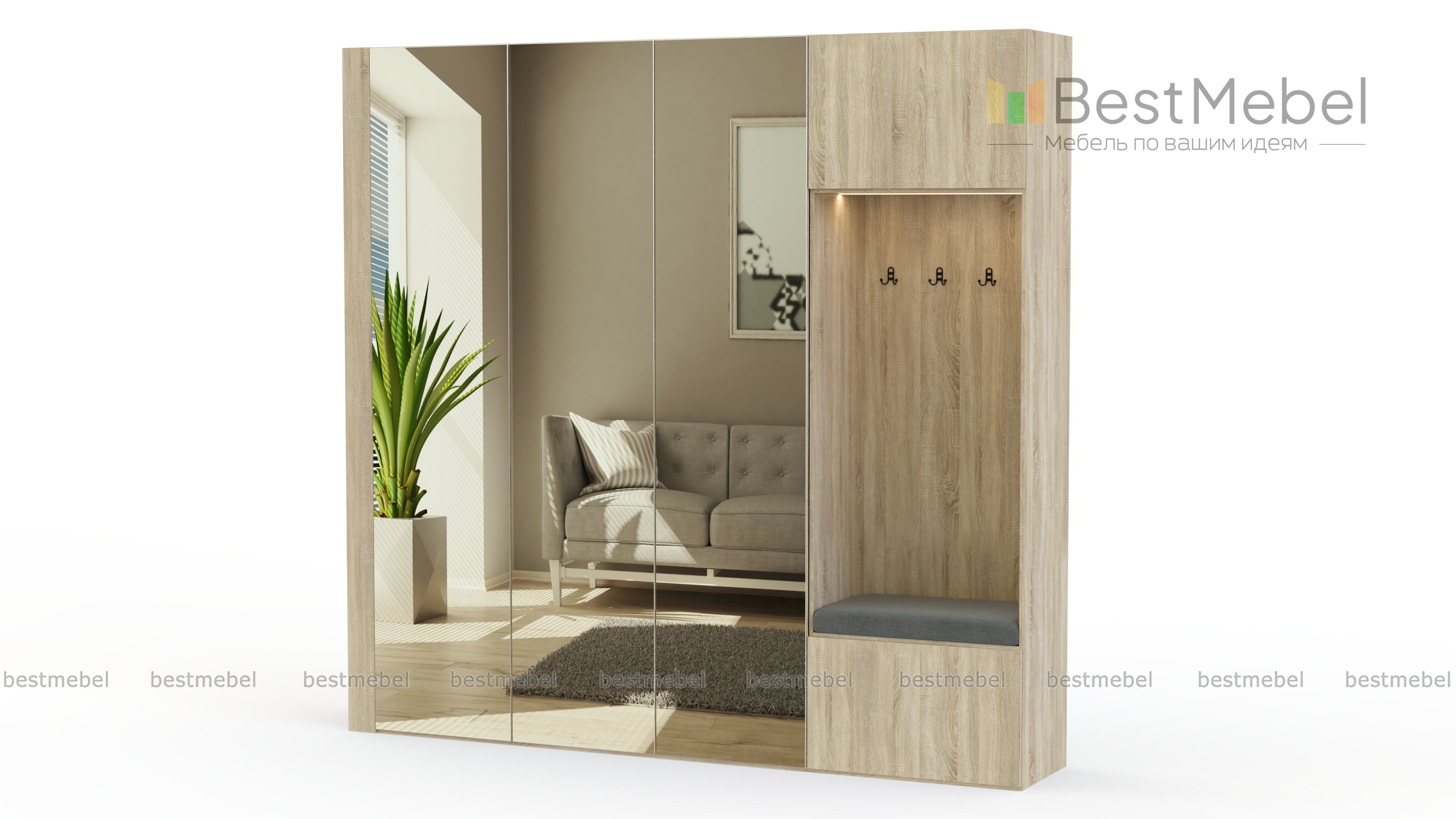 Прихожая Нептун 12 BMS объединила вместительный трехдверный шкаф для одежды и модуль с крючками, антресолью и тумбой для обуви с мягкой обивкой. Сочетание древесных оттенков с зеркалами и встроенной подсветкой создает элегантный современный дизайн. Сплошной зеркальный фасад эффектно смотрится и визуально расширяет границы комнаты. Купить прихожую Нептун 12 BMS вы сможете в нашем интернет-магазине, самостоятельно подобрав размеры и цветовое решение.