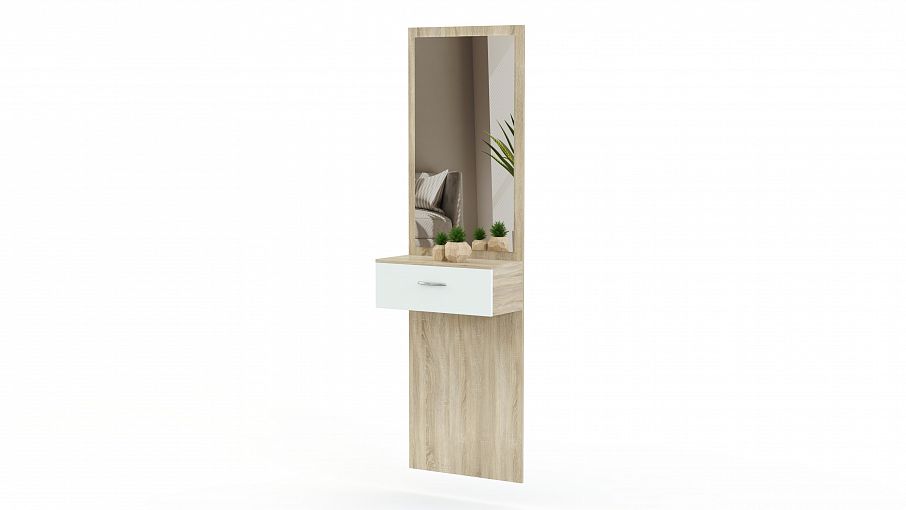Зеркало Феникс-2 BMS может стать частью модульного комплекта для прихожей или использоваться в домашнем интерьере самостоятельно. Комбинированная конструкция представляет собой вертикальную панель с зеркалом и выдвижным ящиком для мелочей. Лаконичность дизайна и популярное цветовое решение – светлые древесные оттенки и белый, позволит гармонично вписать модель в меблировку современных квартир. Купить зеркало Феникс-2 BMS по демократичной цене приглашаем в наш интернет-магазин.