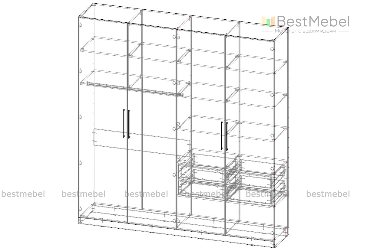 Шкаф распашной справа  платье- со  штангой овал, слева -белье с полками и снизу выдвижные ящики, петли с доводчиком, направляющие на ящиках с доводчиком.
