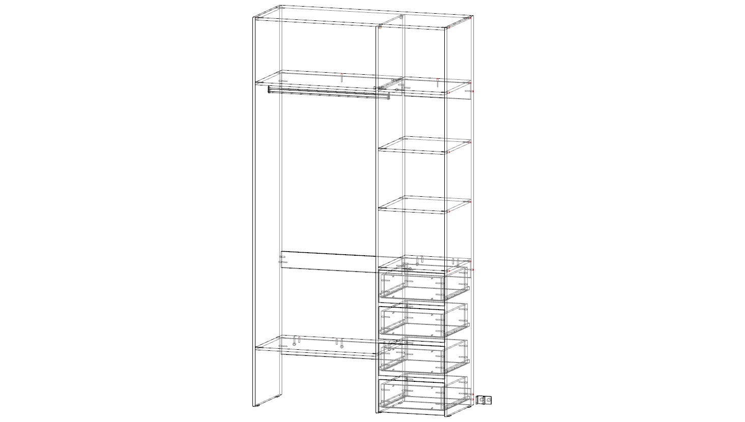 Стеллаж для одежды Мирта 2 BMS поможет вам организовать хранение дома или в торговом зале. Открытая конструкция со штангой, полками и рядом из четырех выдвижных ящиков подходит для размещения одежды на вешалках, коробок с обувью и мелкого трикотажа. Материал изготовления – устойчивая к износу и долговечная ламинированная плита в базовом оттенке.