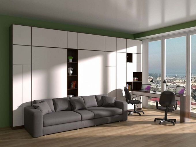 Шкаф-кровать c диваном Вероника BMS – отличный выбор для обустройства современной молодежной комнаты. Многофункциональная композиция, объединившая удобную систему хранения, зону отдыха и рабочее место, позволит значительно сэкономить пространство и создать ультрамодный минималистичный интерьер. Лаконичный шкаф с антресолью, глухими отделениями и открытыми полками дополнен письменным столом с выдвижными ящиками, объемным мягким диваном и двумя раскладными кроватями. Купить шкаф-кровать c диваном Вероника BMS приглашаем в наш интернет-магазин.