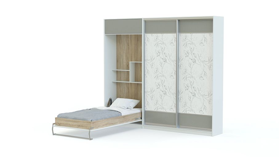 Шкаф-кровать трансформер Форма 130 BMS – универсальный вариант для спальни или гостиной. Современная многофункциональная композиция 2 в 1 – это комфорт, надежность, экономия пространства и времени на уборку постельного белья. Модель оборудована вместительным шкафом-купе для хранения гардероба, антресолью и модулем-трансформером с откидной кроватью. Декорированные абстрактным рисунком фасады помогут создать запоминающийся, яркий интерьер. Купить шкаф-кровать трансформер Форма 130 BMS с учетом необходимых параметров приглашаем к нам в интернет-магазин.