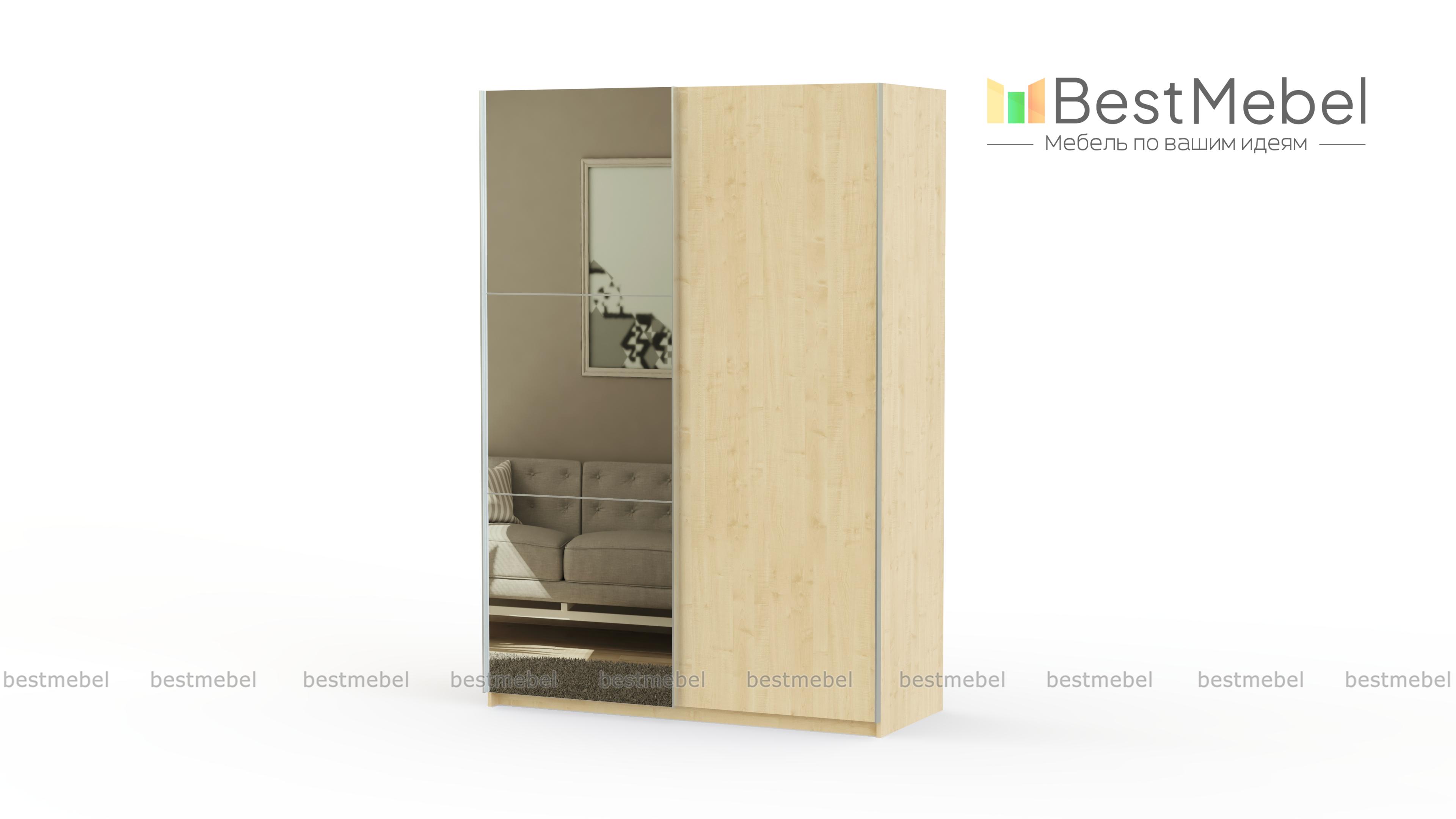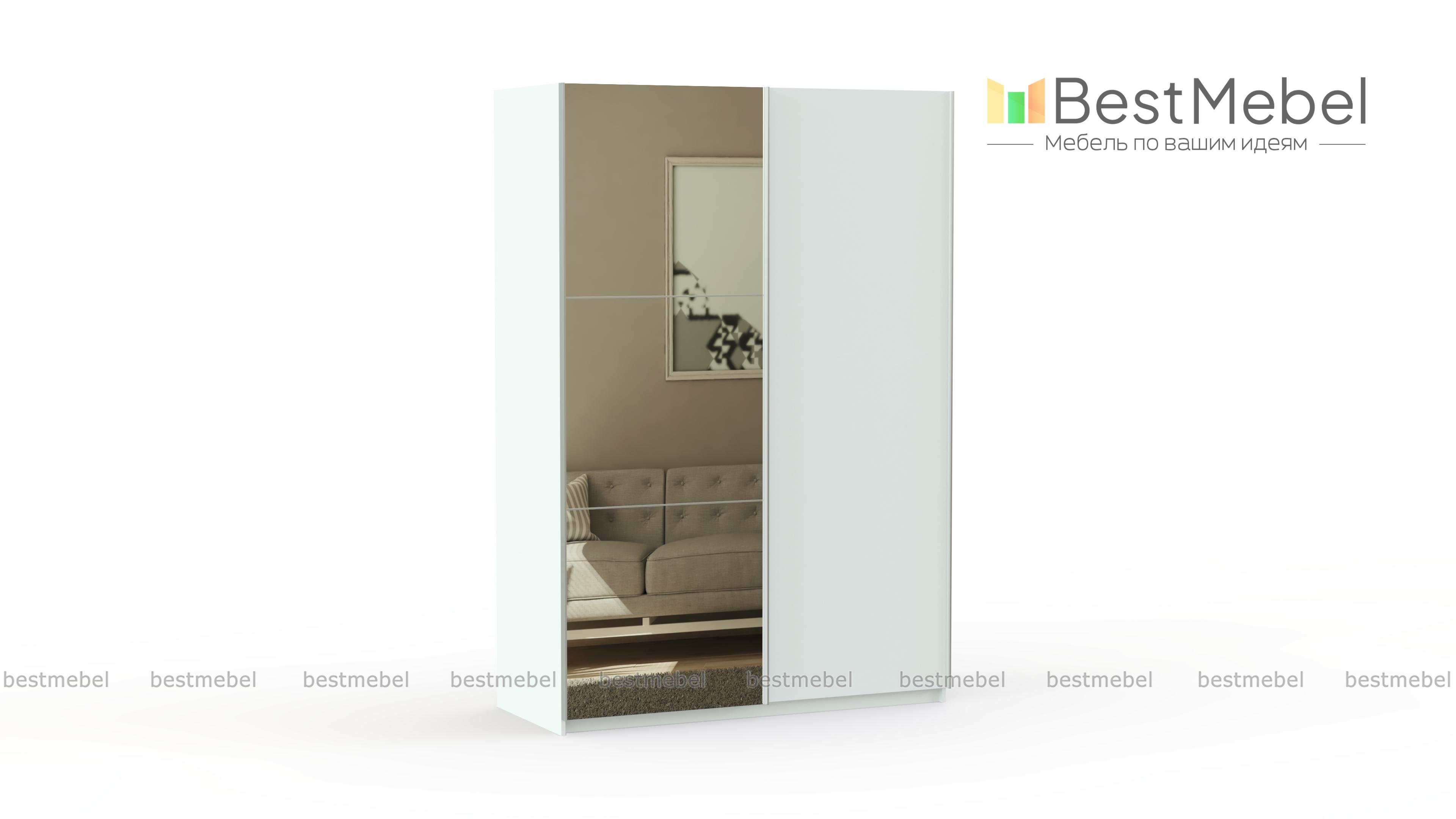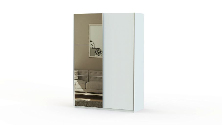 Ультрасовременный шкаф-купе с оригинальным дизайном. Светлый фасад и зеркала делают конструкцию визуально легкой и не громоздкой. Шкаф изготовлен из ламинированного ДСП, которое не подвержено действию механических повреждений, стойкое к влаге и простое в уходе.