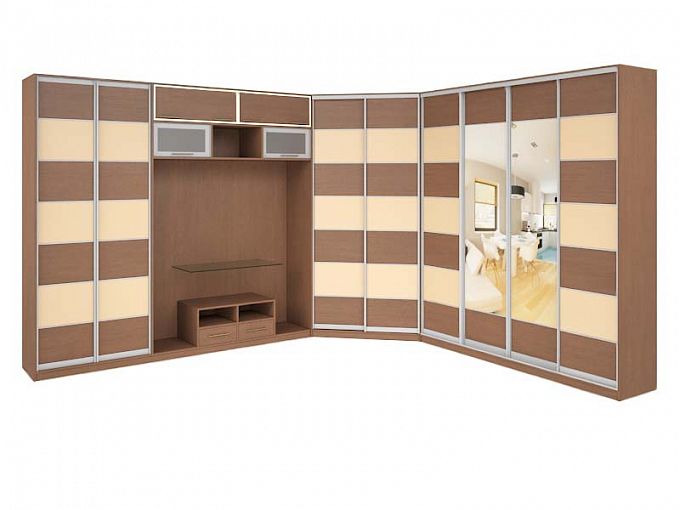 Шкаф-купе TV-21 BMS станет выгодным приобретением для владельцев просторных гостиных. Расположенная вдоль двух стен угловая конструкция эффективно использует пространство и позволит компактно разместить вещи всех членов семьи. Шкафы с раздвижными дверцами дополнены секцией с тумбой, открытой полкой и антресолью, удобной для панели ТВ, аудио- и видеоаппаратуры. Цветовое решение в бежевых тонах гармонично дополнит современные интерьеры, а зеркальные вставки добавят комнате глубины. Купить шкаф-купе TV-21 BMS приглашаем в наш интернет-магазин.
