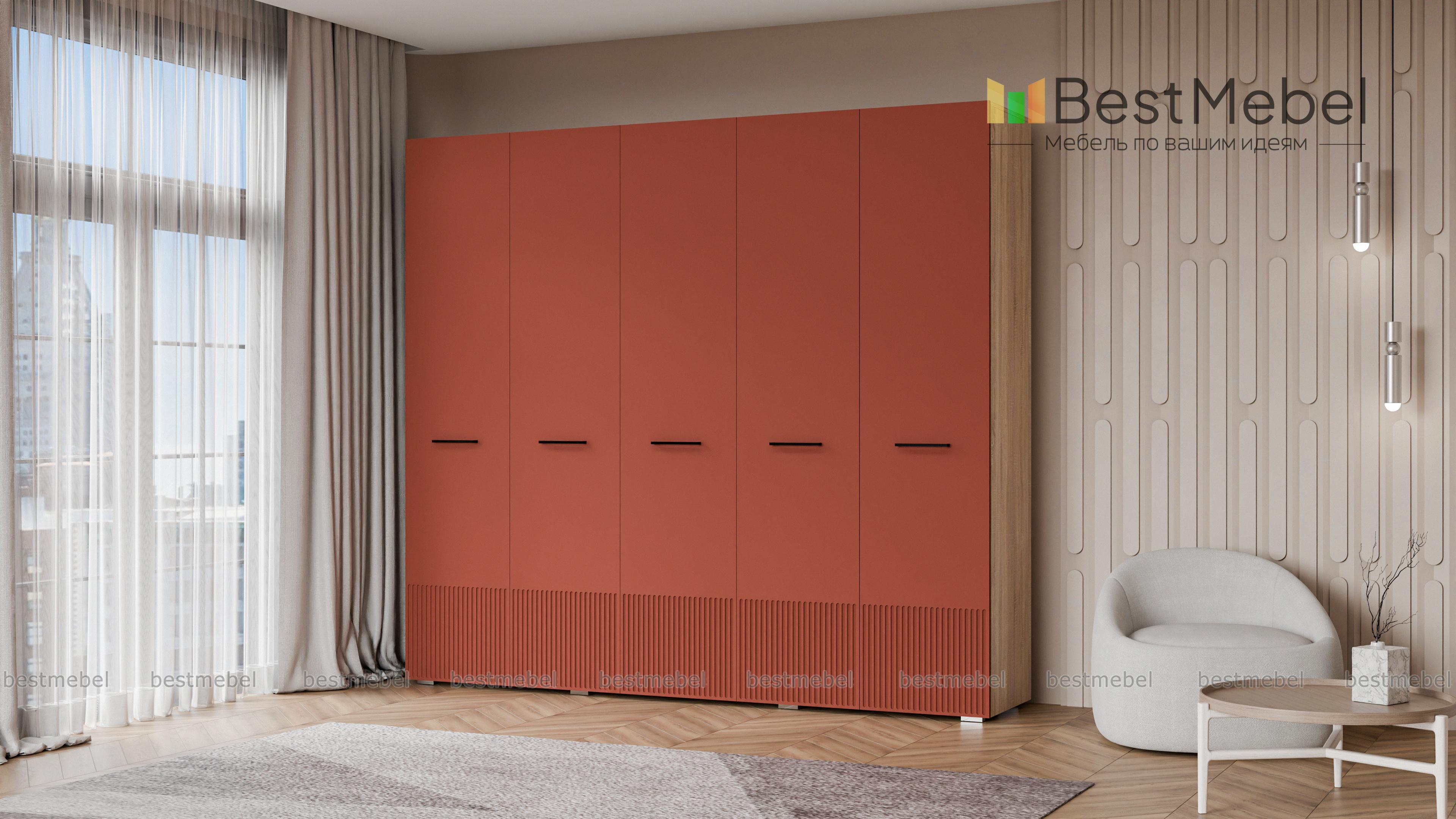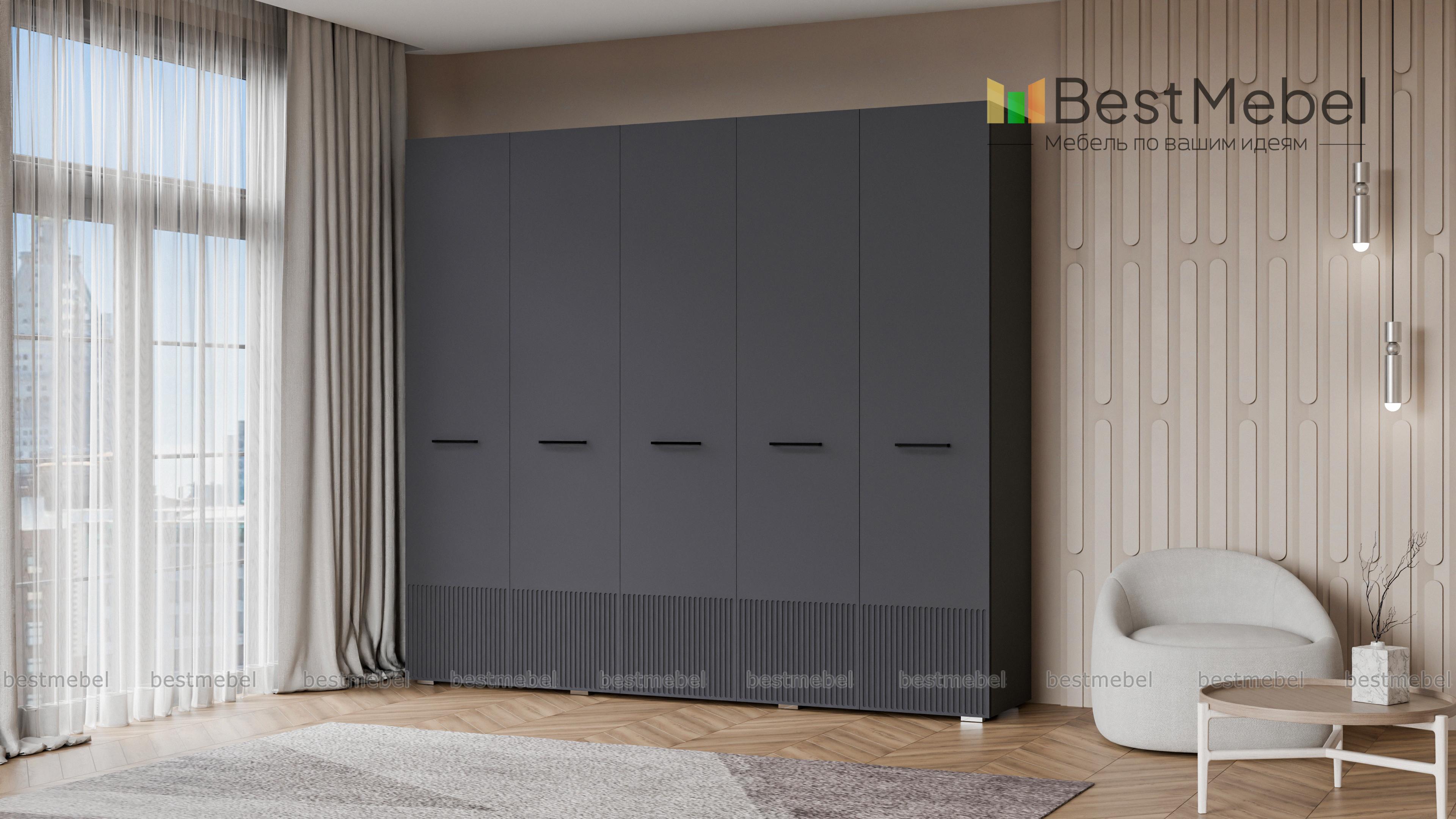 Шкаф распашной Декарт 5 BMS сочетает простую традиционную форму и актуальный дизайн. На сплошном светлом фасаде из МДФ выделяются поперечные ручки-скобы и фрезерованный рельеф, создавая визуально легкую конструкцию. Пятидверный гардероб позволяет организовать хранение с помощью пары штанг, вместительных верхних и бельевых полок. Купить шкаф распашной Декарт 5 BMS в удобном размере и любых оттенках из каталога вы сможете на сайте нашего интернет-магазина.