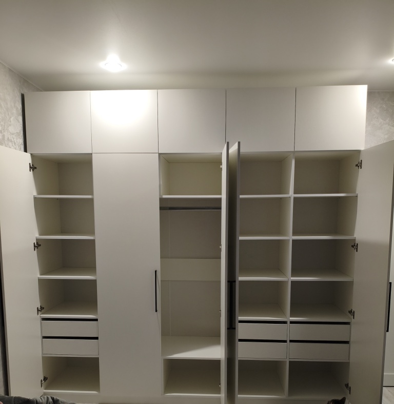 Заказ 00000275042, шкаф распашной Остин Лайт 6 BMS (1700х2500х500). Это не первый мой шкаф с БестМебель. Классно, что можно придумать свое наполнение, очень удобно. В целом качество нормальное, кое-где есть микро сколы, но их видно только при ближайшем рассмотрении, но не при ежедневном использовании. Фурнитура приемлемая, только на верхних полках мы просили не устанавливать пуш-ту-опен механизм, иначе дверцы немного оттопыриваются. Но поскольку туда убраны редко используемые вещи, это не проблема. Так что могу рекомендовать, особенно если требуется какое-то нестандартное исполнение.