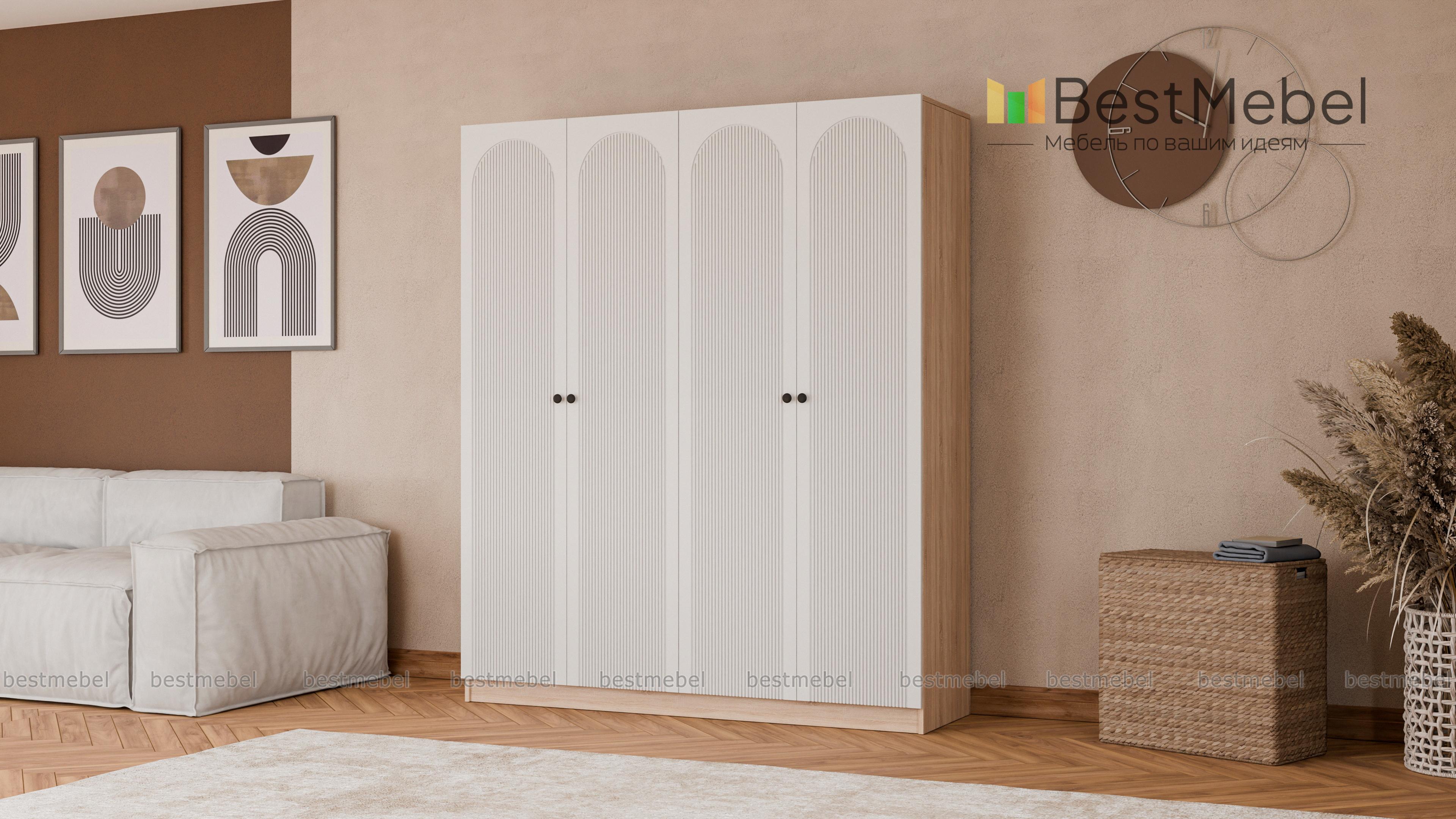 Шкаф распашной Рене 29 BMS — вместительный и очень стильный в темном оформлении. Фасад этой четырехдверной модели, изготовленной из ламинированной ДСП и МДФ, украшает геометричная фрезеровка с элегантными арками, на дверцы установлены небольшие круглые ручки. Два платяных отделения — оптимальное решение для хранения одежды, обуви и аксессуаров двух человек. Купить шкаф распашной Рене 29 BMS вы сможете на сайте нашего интернет-магазина, по желанию изменив размеры, цвет и компоновку.