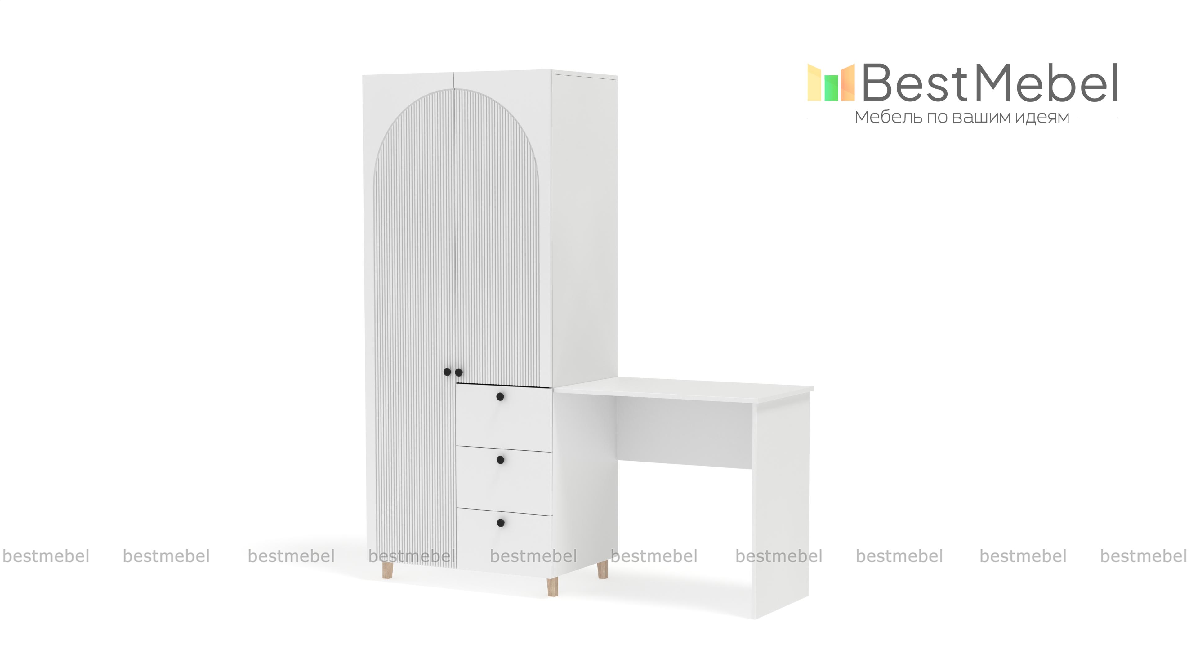 Шкаф со столом Вивьен 4 BMS значительно экономит пространство небольшой комнаты. Компактный гардероб с распашными дверцами и рядом из трех выдвижных ящиков объединен со столиком, удобным для учебы, работы и творчества. Стильный дизайн с высокими опорами, фрезерованной отделкой фасада и трендовыми оттенками украсит интерьер современной квартиры. Купить шкаф со столом Вивьен 4 BMS вы сможете в нашем интернет-магазине с изготовлением по индивидуальным размерам.