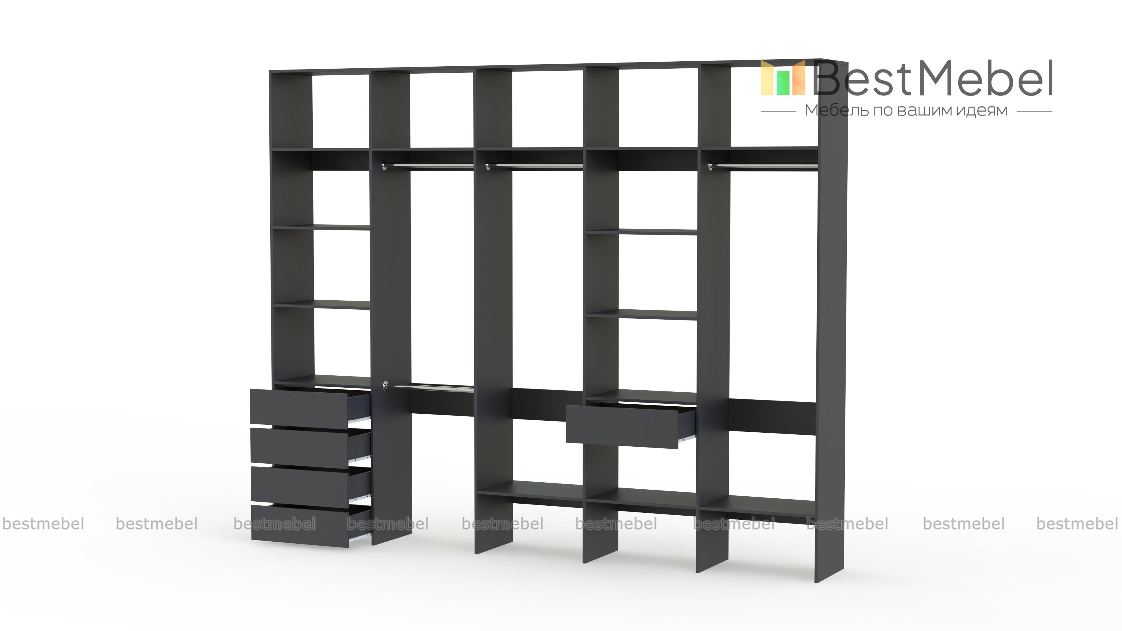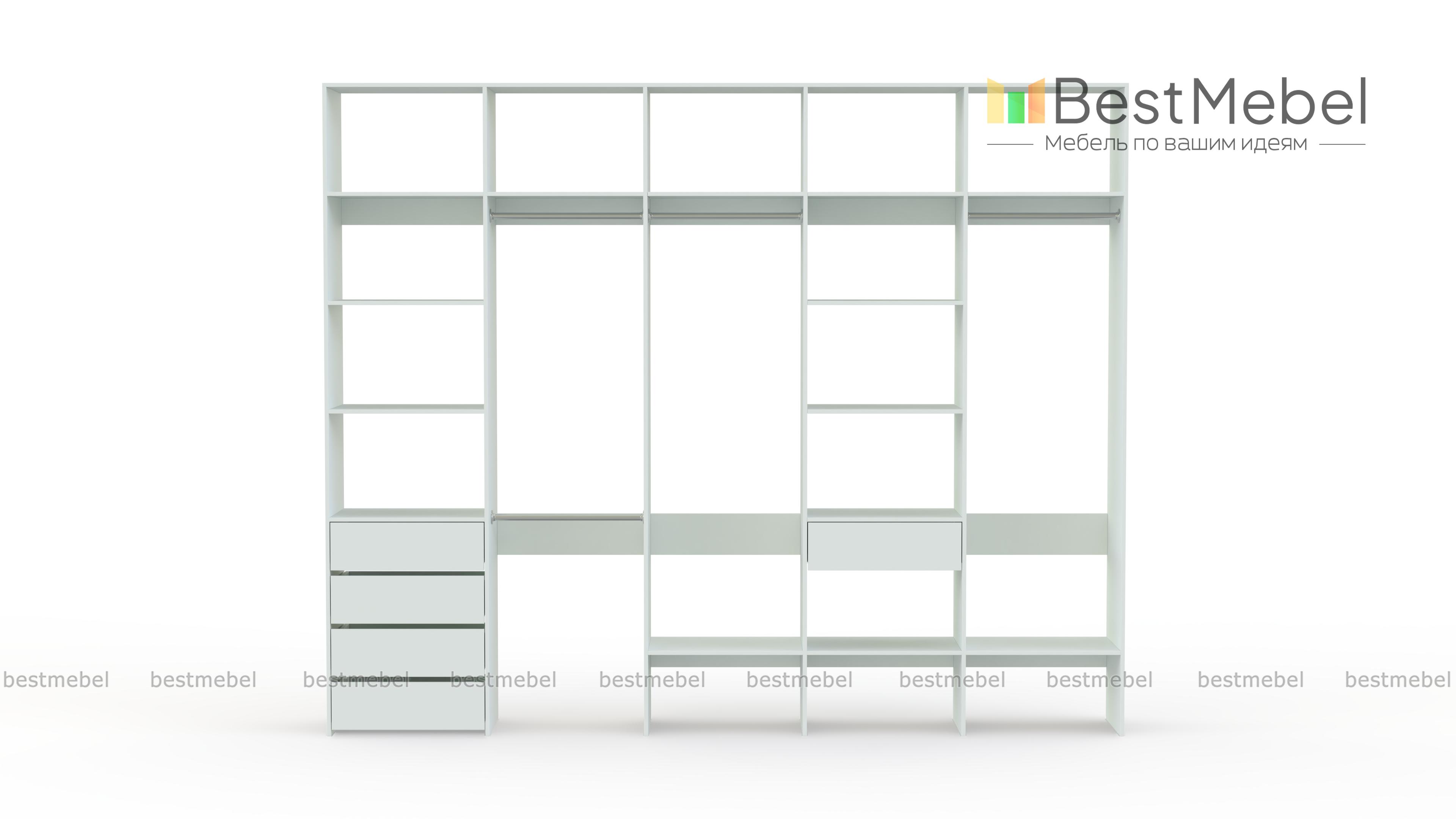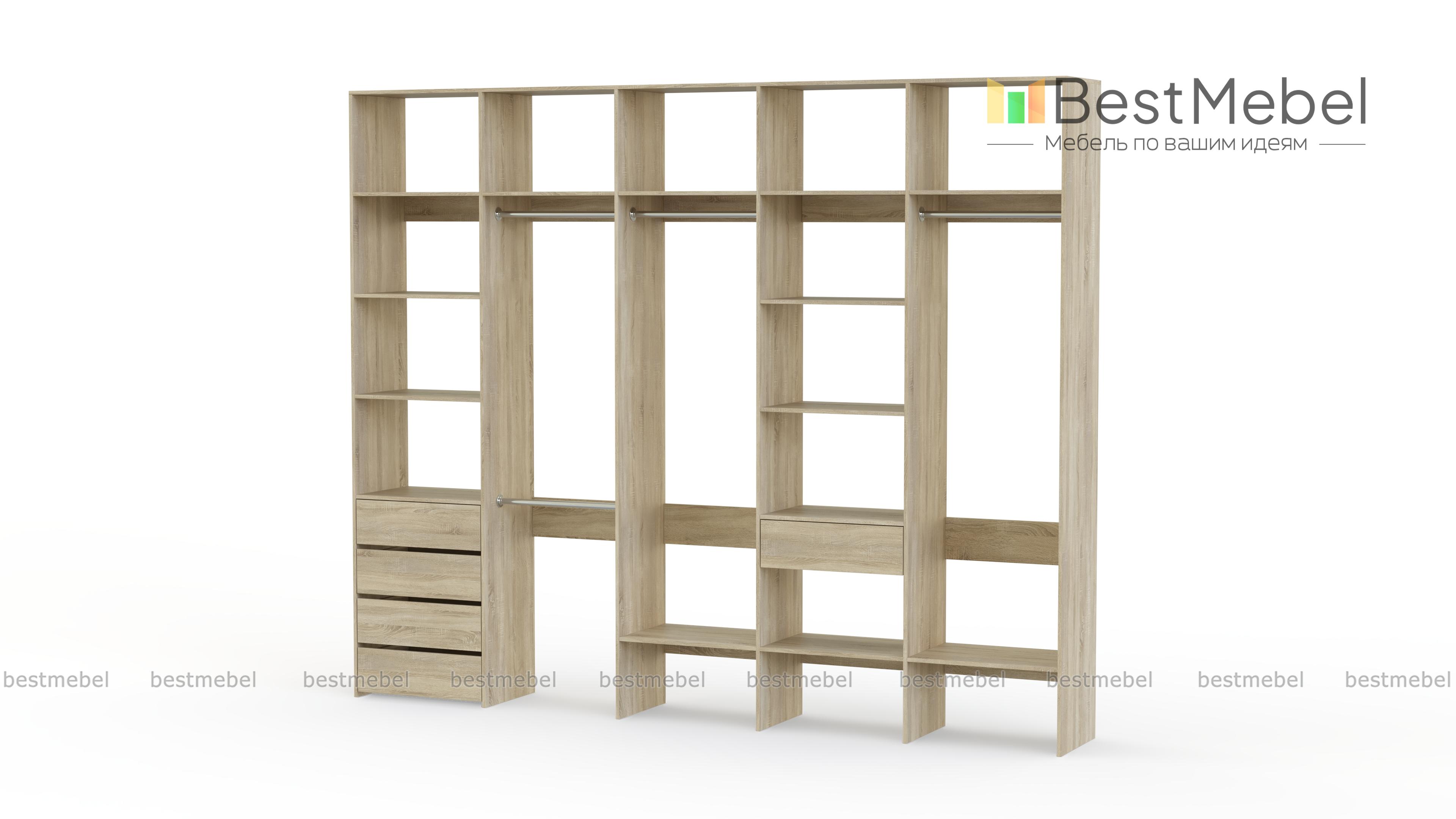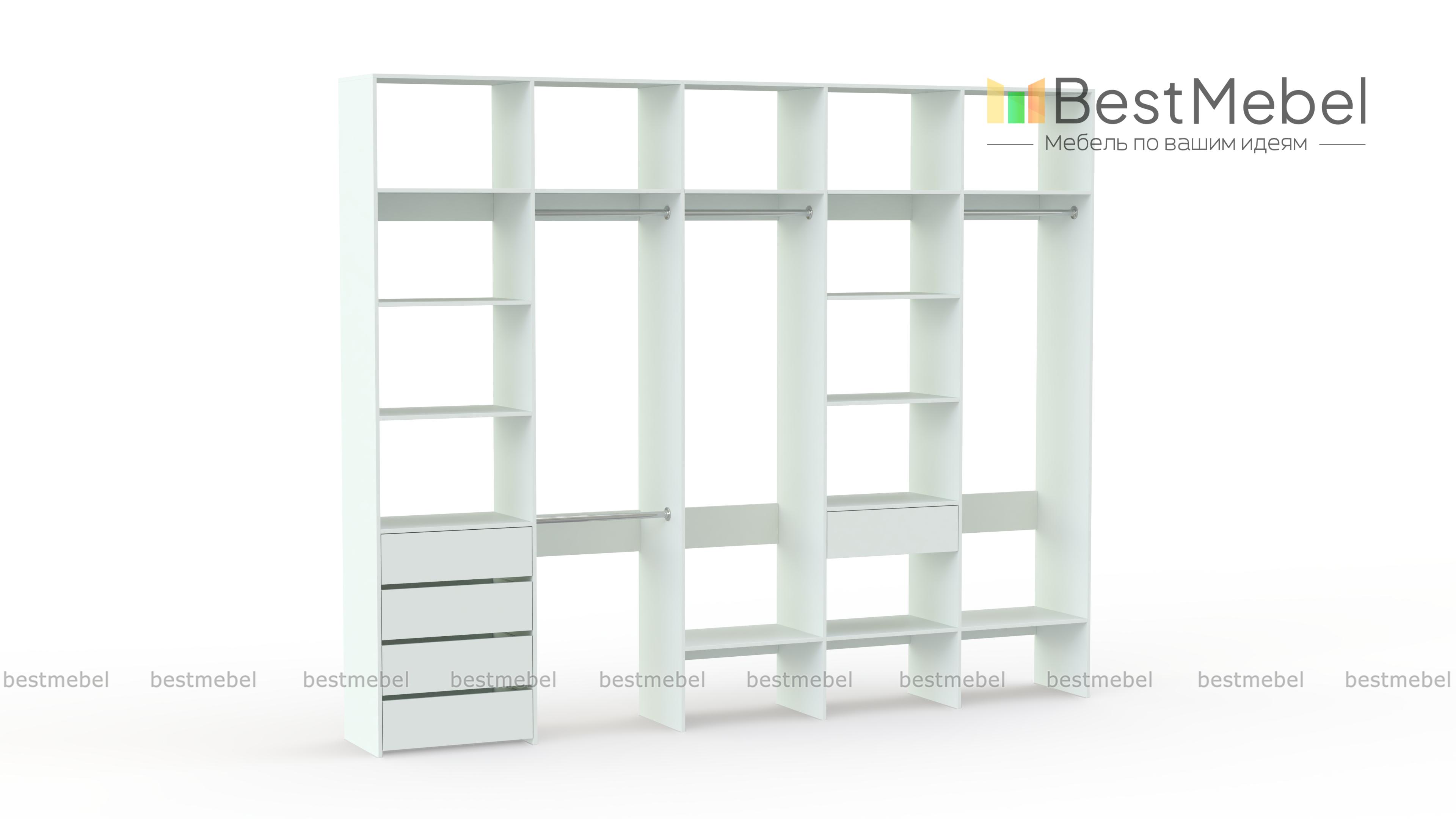 Стеллаж для одежды Мирта 73 BMS удобно зонирует пространство для хранения. Четыре штанги и полки позволят рассортировать одежду по категориям, расположенные на нижнем уровне полки удобны для создания обувниц, а в ящики можно убрать аксессуары, белье и другие мелочи. Дизайн стеллажа лаконичен и универсален, а поверхности из ламинированной ДСП устойчивы к влаге и появлению царапин. Купить стеллаж для одежды Мирта 73 BMS, изготовленный по вашим размерам, вы сможете в нашем интернет-магазине.