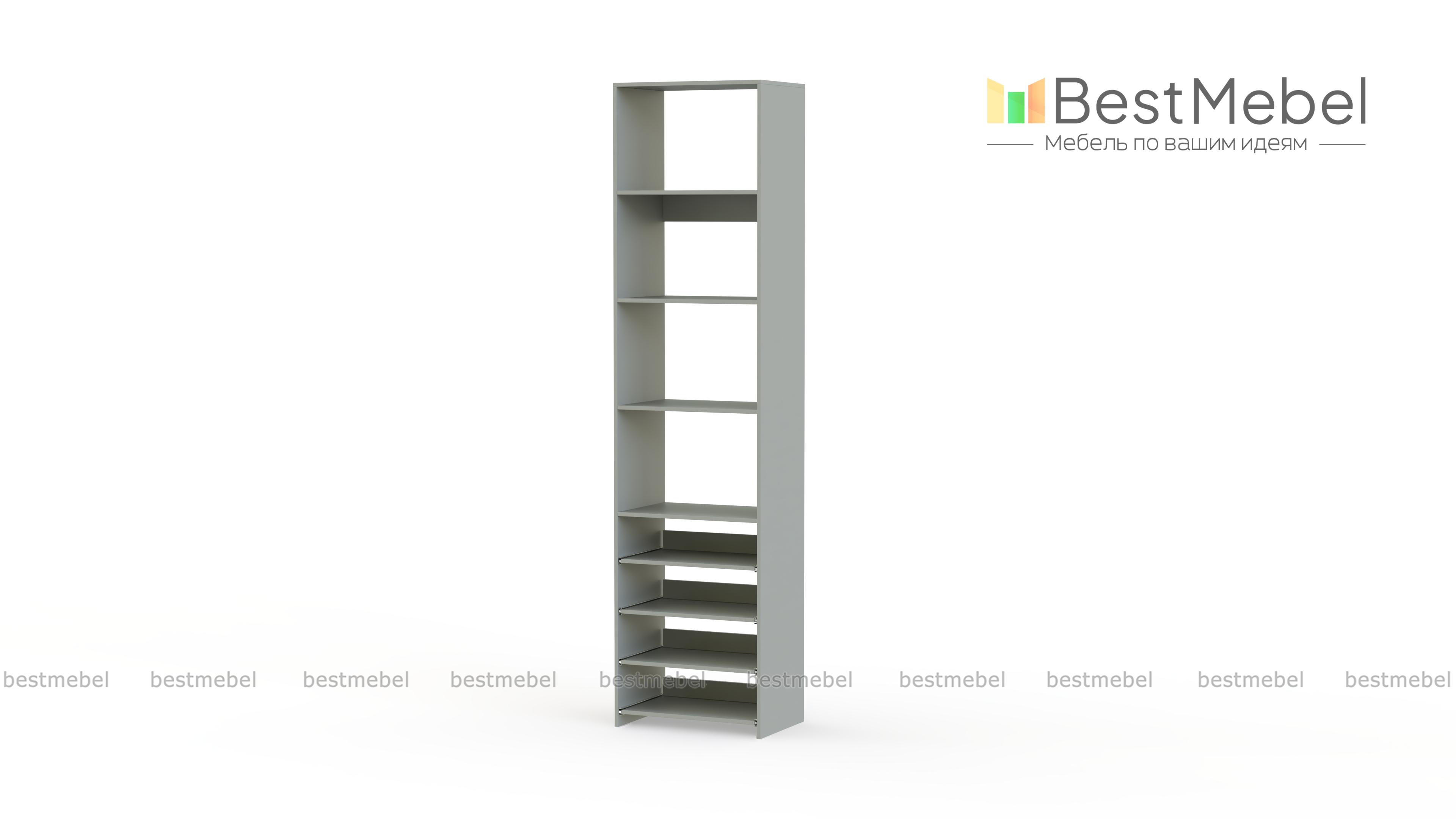 Стеллаж для одежды Мирта 74 BMS прекрасно подходит для небольшого количества вещей. В узком стеллаже, оснащенном четырьмя стандартными и четырьмя выдвижными полками можно хранить сложенную одежду, сезонную обувь и всевозможные аксессуары. Открытая конструкция обеспечивает удобный доступ к содержимому полок и упрощает уборку. Купить стеллаж для одежды Мирта 74 BMS, изготовленный по индивидуальным размерам, можно недорого на сайте нашего интернет-магазина.
