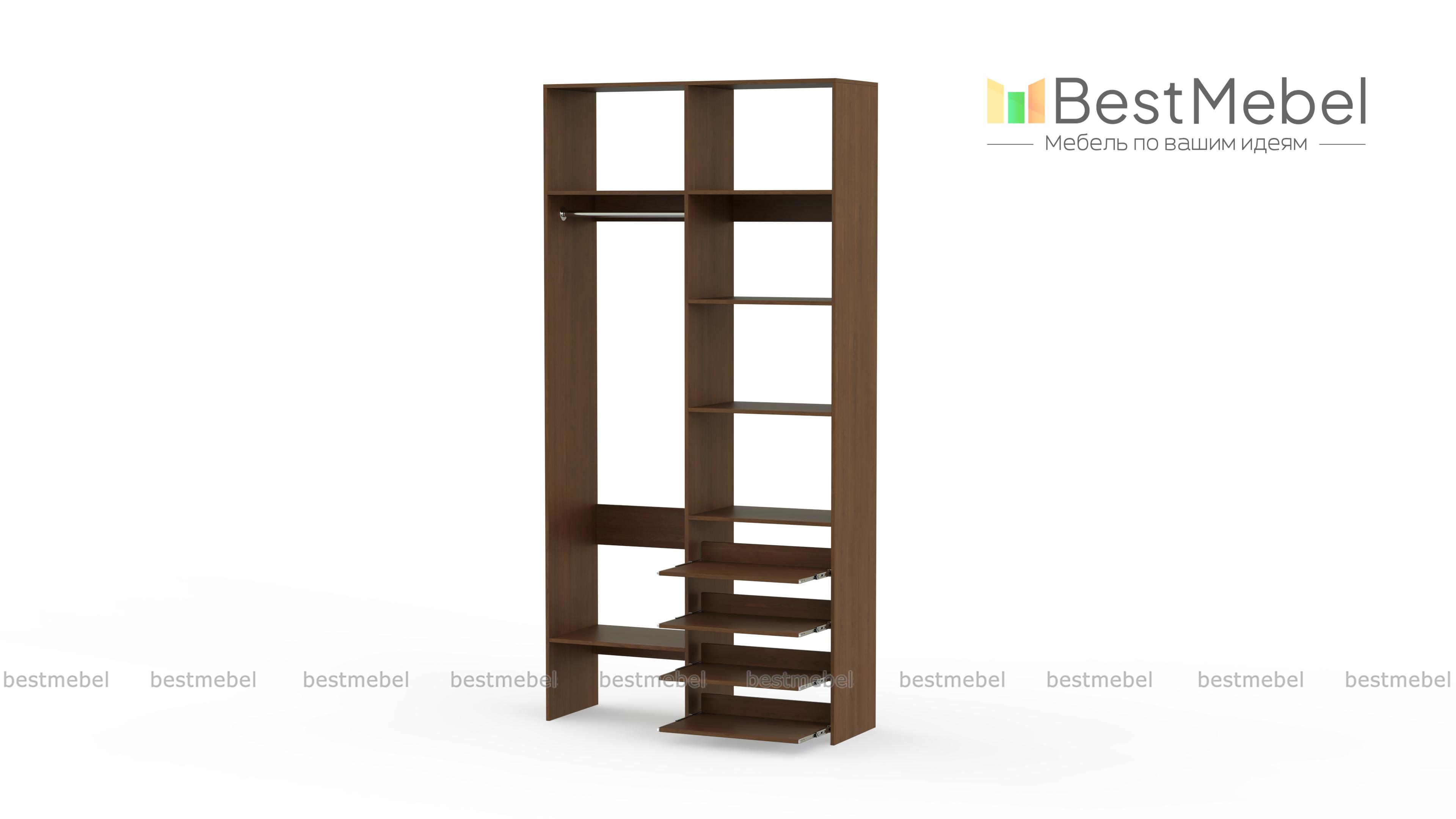 Стеллаж для одежды Мирта 79 BMS подойдет вам, если вещей немного. Компактная по ширине конструкция оборудована не только штангой для вешалок и стандартным набором бельевых полок, но и четырьмя выдвижными панелями. В нейтральном природном оттенке стеллаж выглядит современно, а простая форма хорошо вписывается в пространство. Купить стеллаж для одежды Мирта 79 BMS, изготовленный по индивидуальным размерам, вы всегда сможете на сайте нашего интернет-магазина.