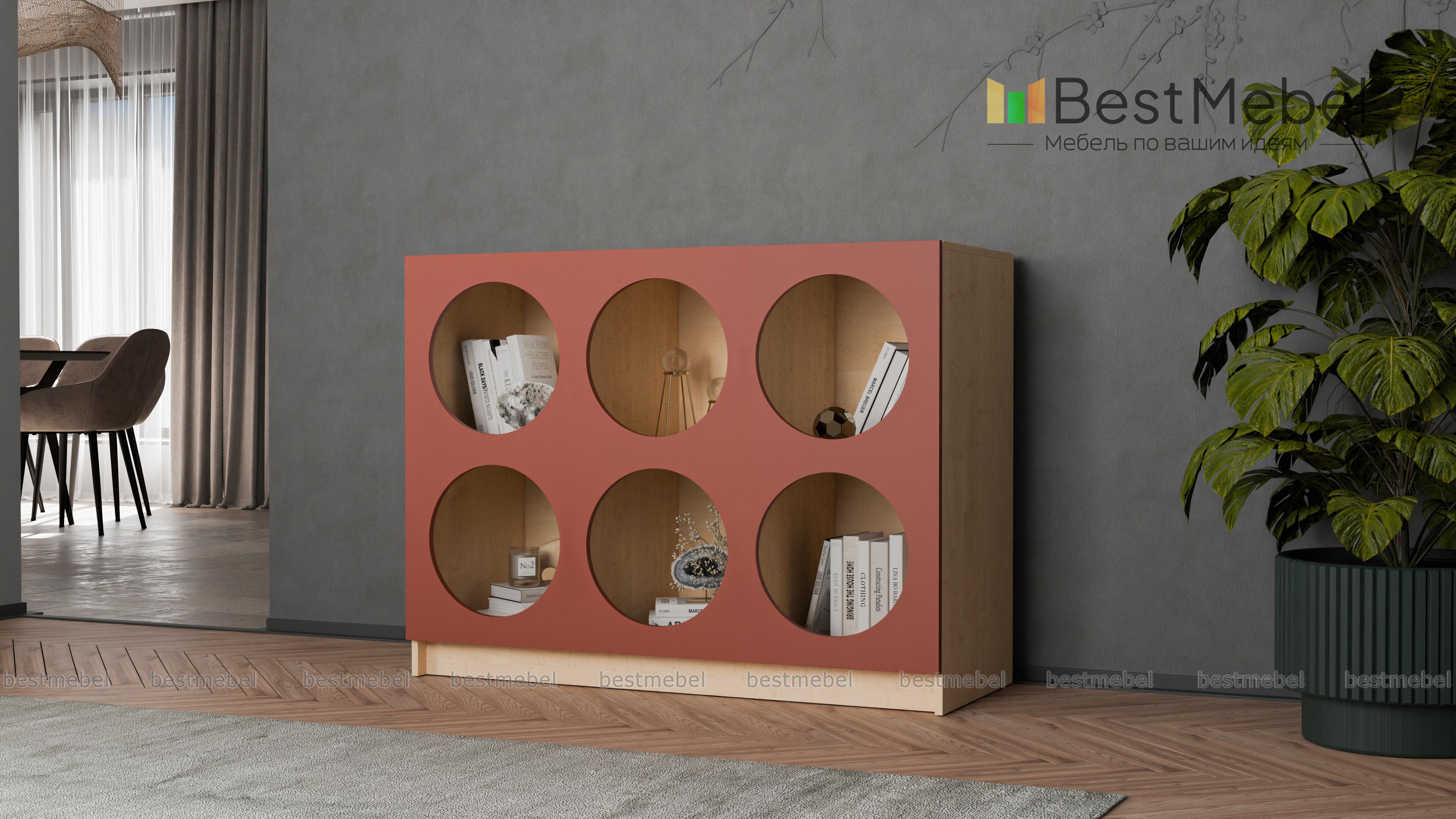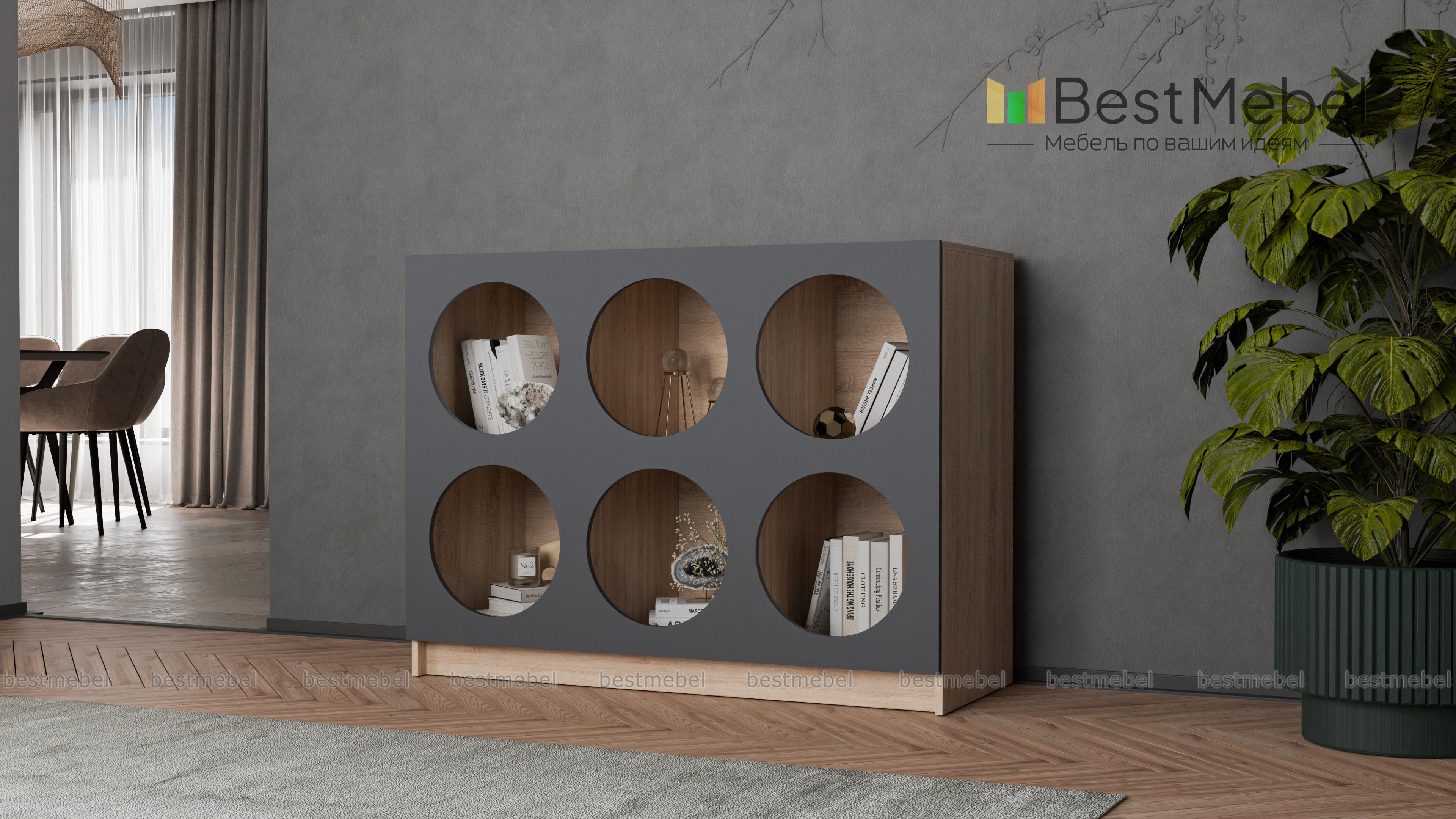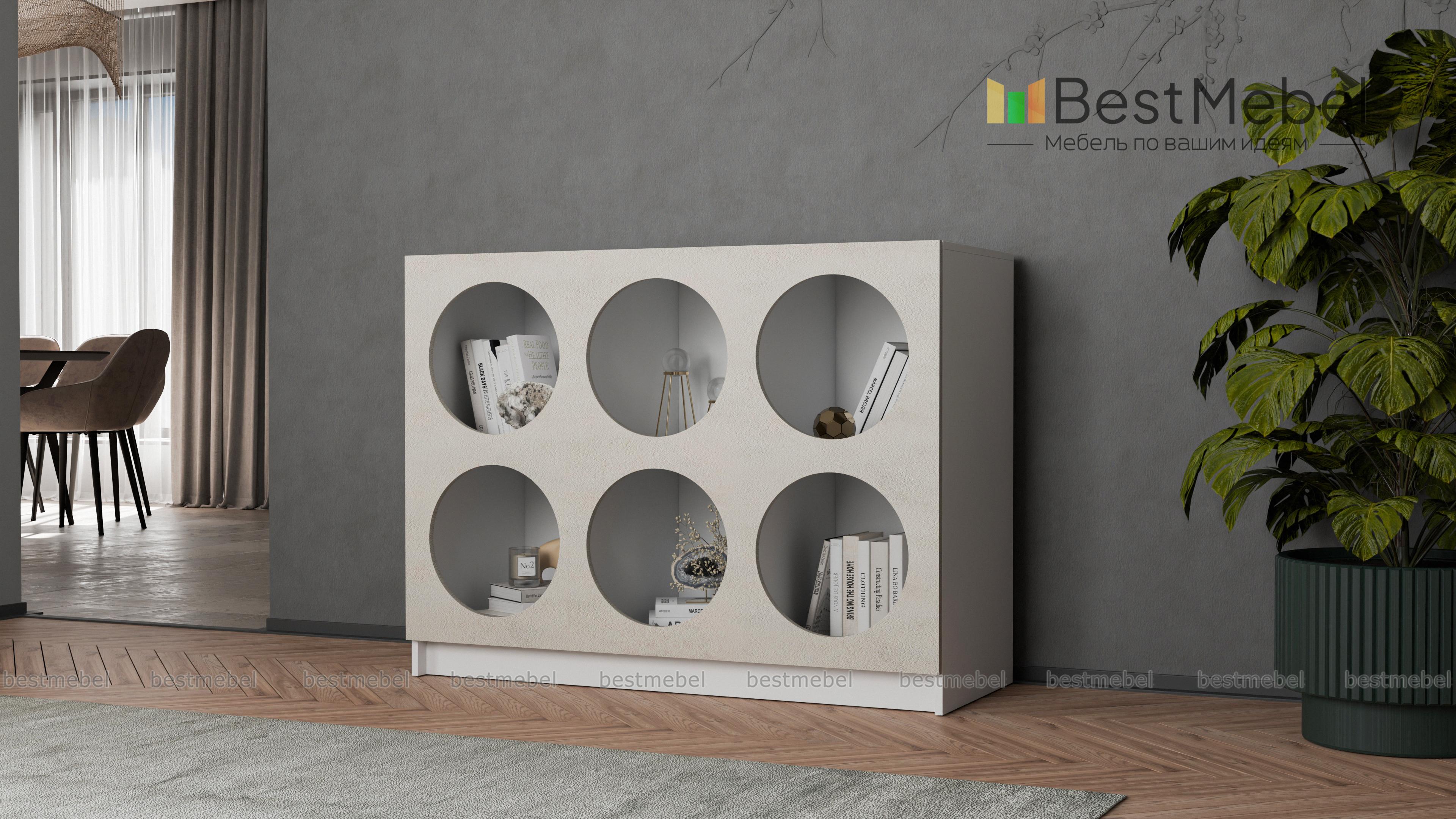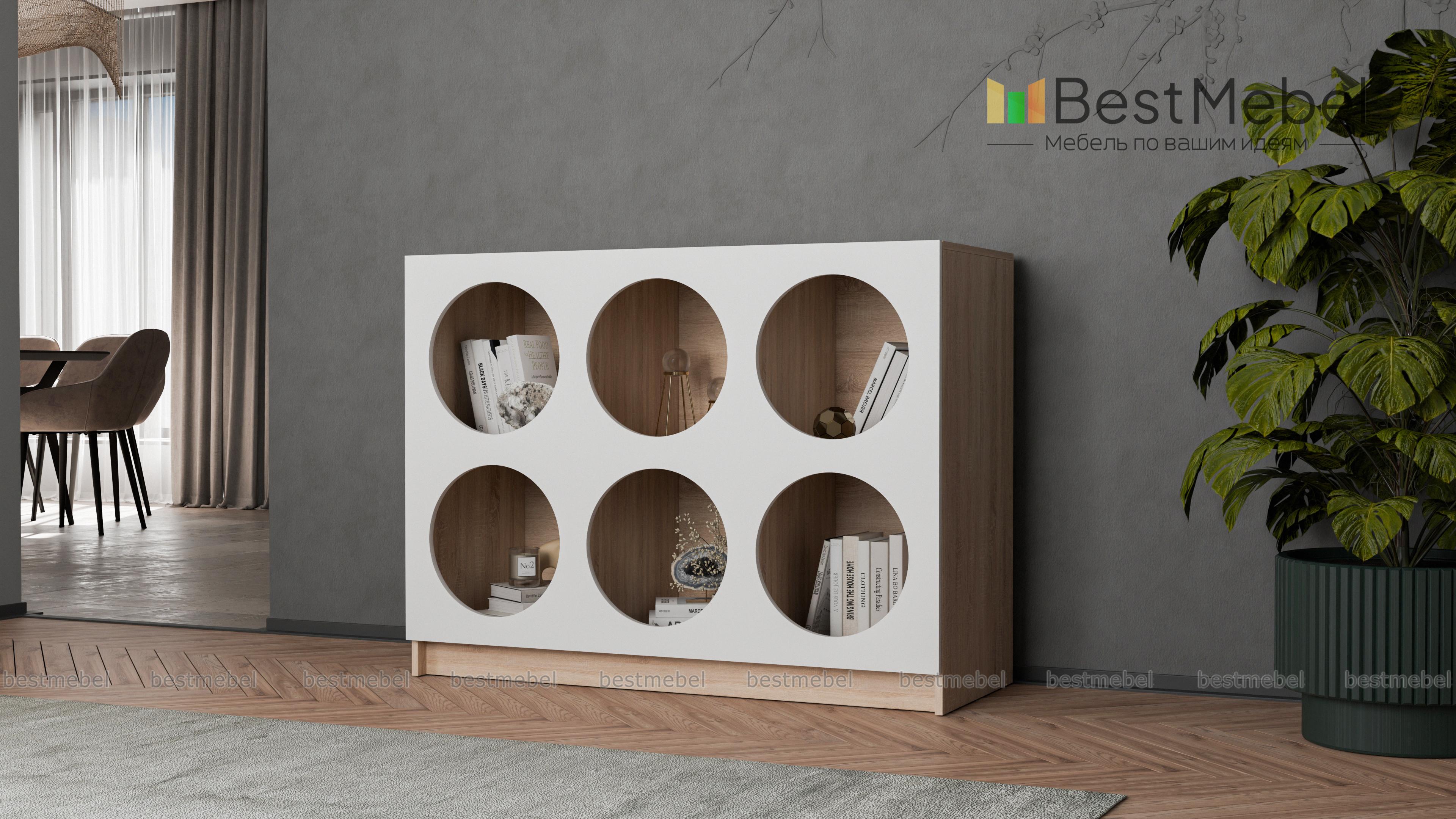 Стеллаж Руди 7 BMS позволит вам интересно выставить книги, предметы коллекции, красивую посуду и другие вещи. Шесть вместительных полок имеют необычные круглые вырезы, превращая практичный предмет меблировки в стильный интерьерный акцент. На широкой верхней панели стеллажа достаточно места для ТВ, любимой вазы или уютного светильника. Купить стеллаж Руди 7 BMS вы сможете по доступной цене на сайте нашего интернет-магазина, подобрав цветовую гамму по своему вкусу.