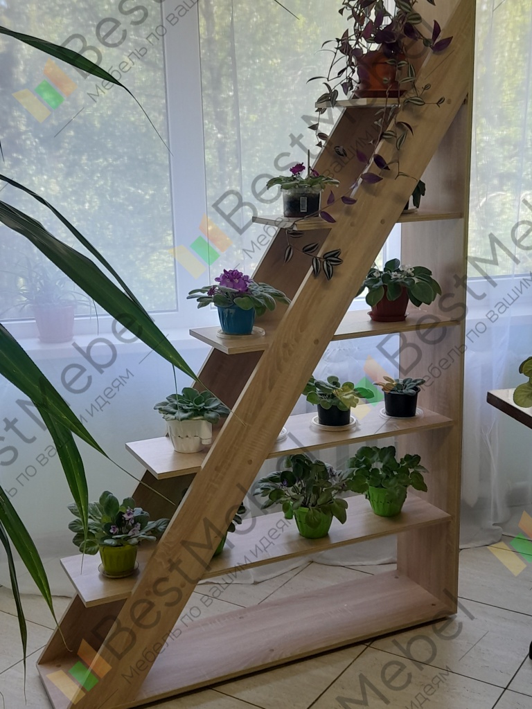 Стеллаж очень красиво смотрится, особенно с фиалками! Заказывали для интерьера холла отеля. Сначала купили один, потом понравилось, заказали и второй. Поставили два симметрично. Один недостаток: не кладут саморезы для крепления ножек. Зато кучу лишних мелких саморезов, которые для ножек не подходят!