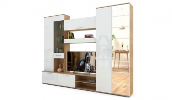 Стенка для гостиной Ламина 4 BMS – это современная модульная композиция для оформления зоны ТВ. В комплект входят низкая тумба с нишами под аппаратуру и двумя закрытыми отделениями, двухдверный платяной шкаф, комбинированный шкаф с витриной и межсекционные полки для книг и интерьерных украшений. Особенно эффектный вид и легкость придают стенке белоснежные глянцевые фасады с зеркальными накладками. Купить стенку для гостиной Ламина 4 BMS приглашаем к нам в интернет-магазин.