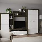 Вместительная стенка Неон 2 BMS выполнена в гармоничном сочетании классических традиций и современной функциональности. Комплект включает платяной шкаф с антресолями, комбинированный шкаф с посудным отделением, тумбу под ТВ и открытую навесную полку. Такая конструкция позволит удобно расположить одежду, посуду, технику, предметы декора и книги. Светлые глянцевые фасады, визуально увеличивающие помещение, гармонично сочетаются с темным корпусом под массив дерева.