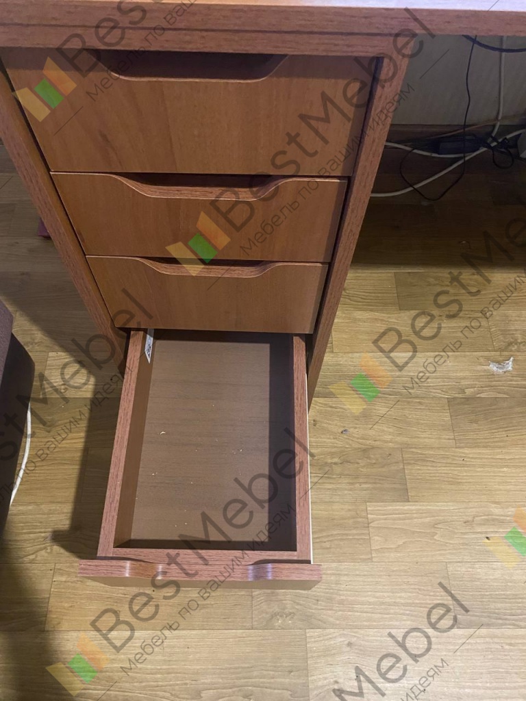 Прекрасный стол, отдельный плюс что модель можно заказать под любой размер, большое количество ящиков так же является огромным плюсом, много полезного пространства и функционала.