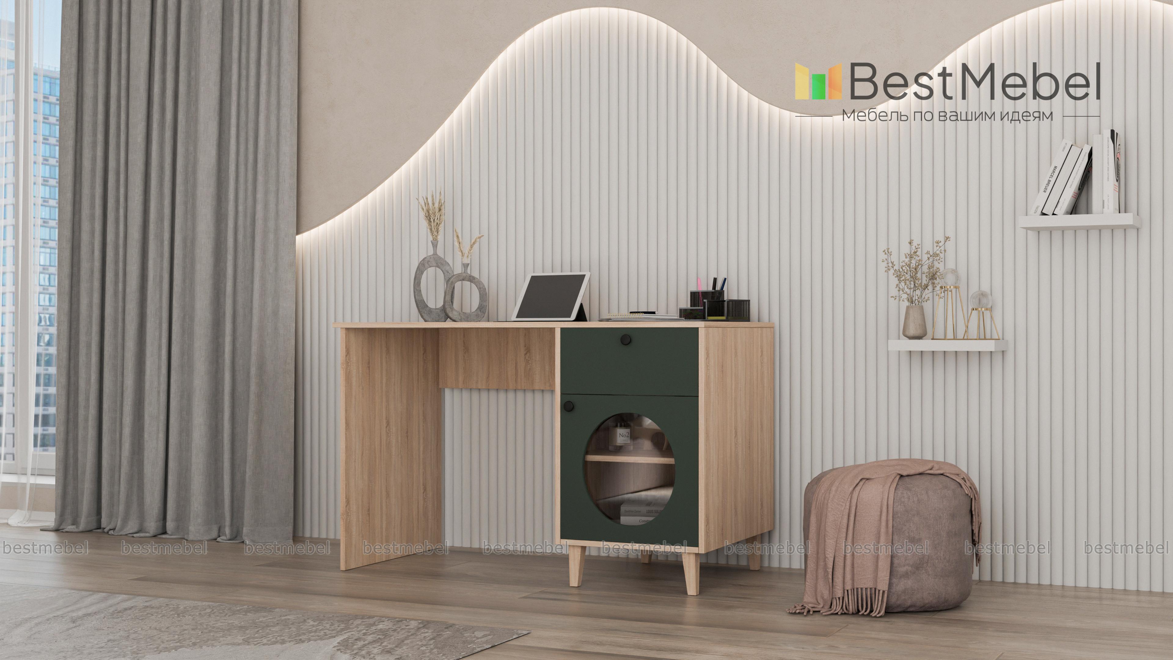 Стол письменный Брукс 1 BMS — это удобное рабочее место и яркий предмет обстановки. Под широкой прямоугольной столешницей располагается тумба, оборудованная ящиком для хранения канцелярских мелочей и распашной секцией со стеклом. Нейтральный цвет корпуса и столешницы комфортен для глаз, а стильный контраст создает темный фасад с фигурным вырезом. Купить стол письменный Брукс 1 BMS для работы дома или в офисе вы всегда сможете на сайте нашего интернет-магазина.