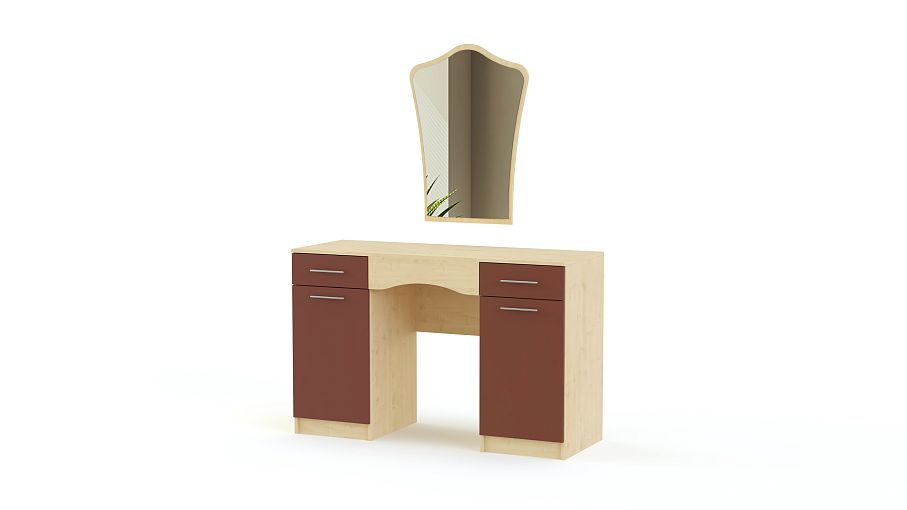 Туалетный столик СП-488 BMS сочетает классический дизайн с трендовым цветовым решением в терракотовых и древесных тонах. Двухтумбовый стол с просторной столешницей может использоваться как рабочий или макияжный и легко разместит в быстром доступе необходимые уходовые средства и аксессуары. Дополняет композицию большое навесное зеркало с изящно вырезанным верхом. Купить туалетный столик СП-488 BMS и сделать спальный интерьер функциональным вам поможет наш интернет-магазин.