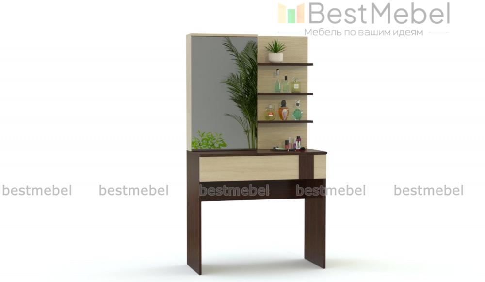 Туалетный столик Зоя 1 BMS сделает спальный интерьер более комфортным и функциональным. Модель лаконичного дизайна с геометричным декором фасада выполнена из качественной ламинированной плиты в контрастных тонах. Прямоугольный столик оборудован просторным выдвижным ящиком под столешницей, зеркальным шкафом и боковыми полочками для удобного хранения уходовых средств. Купить туалетный столик Зоя 1 BMS приглашаем к нам в интернет-магазин.