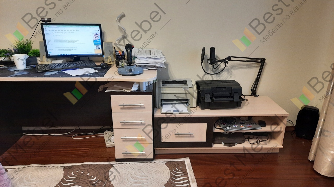 Искали тумбочку под принтер и другую технику в нашу комнату-кабинет. Компьютерный стол был ранее куплен в другом магазине, и требовалось подобрать что-то близкое по стилю и расцветке. За счет того, что для данной тумбы можно самостоятельно выбрать цвет отделки и фурнитуру, она очень хорошо вписалась и "подружилась" со столом. Также очень удобно, что размеры можно заказать произвольные.