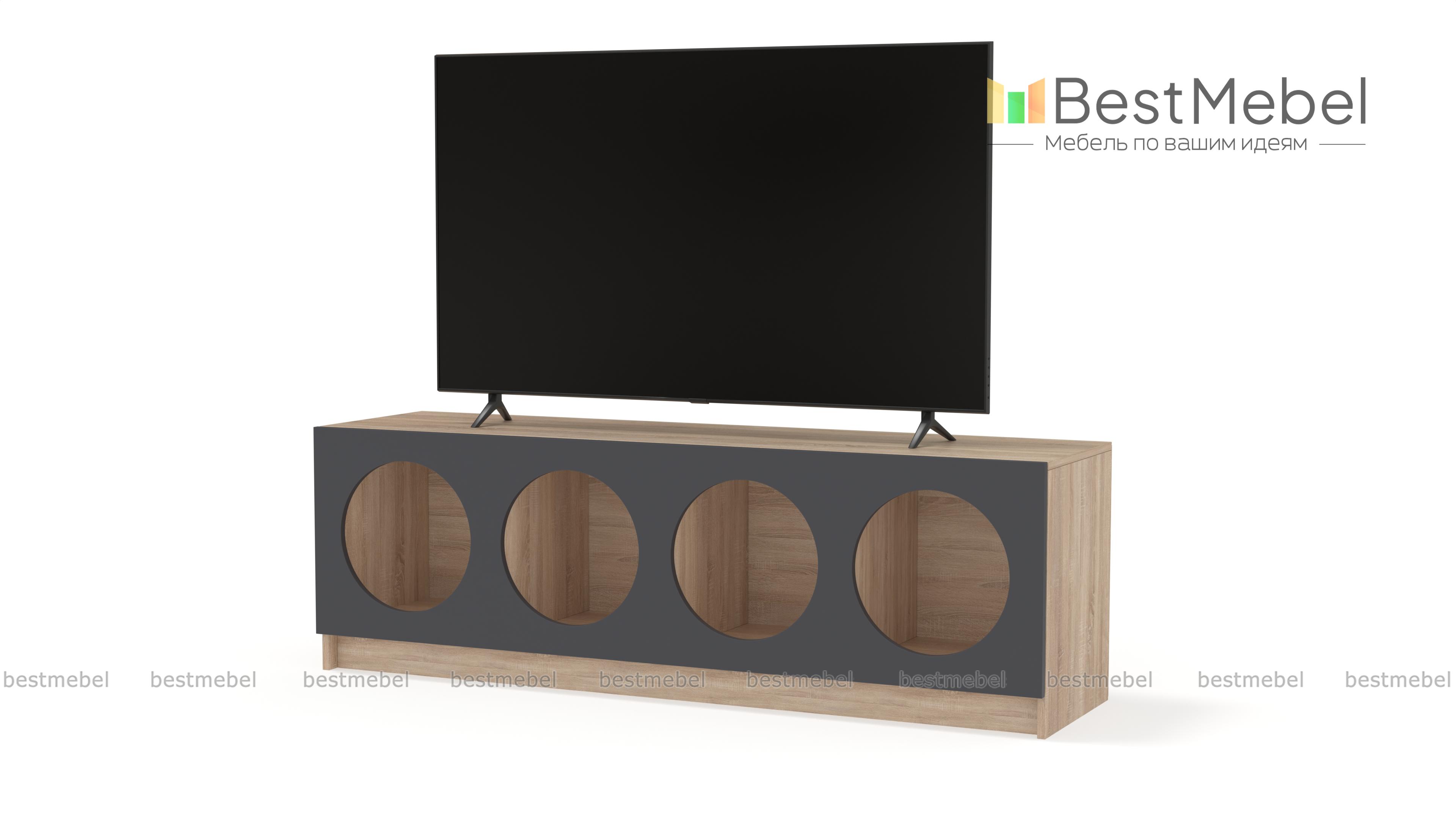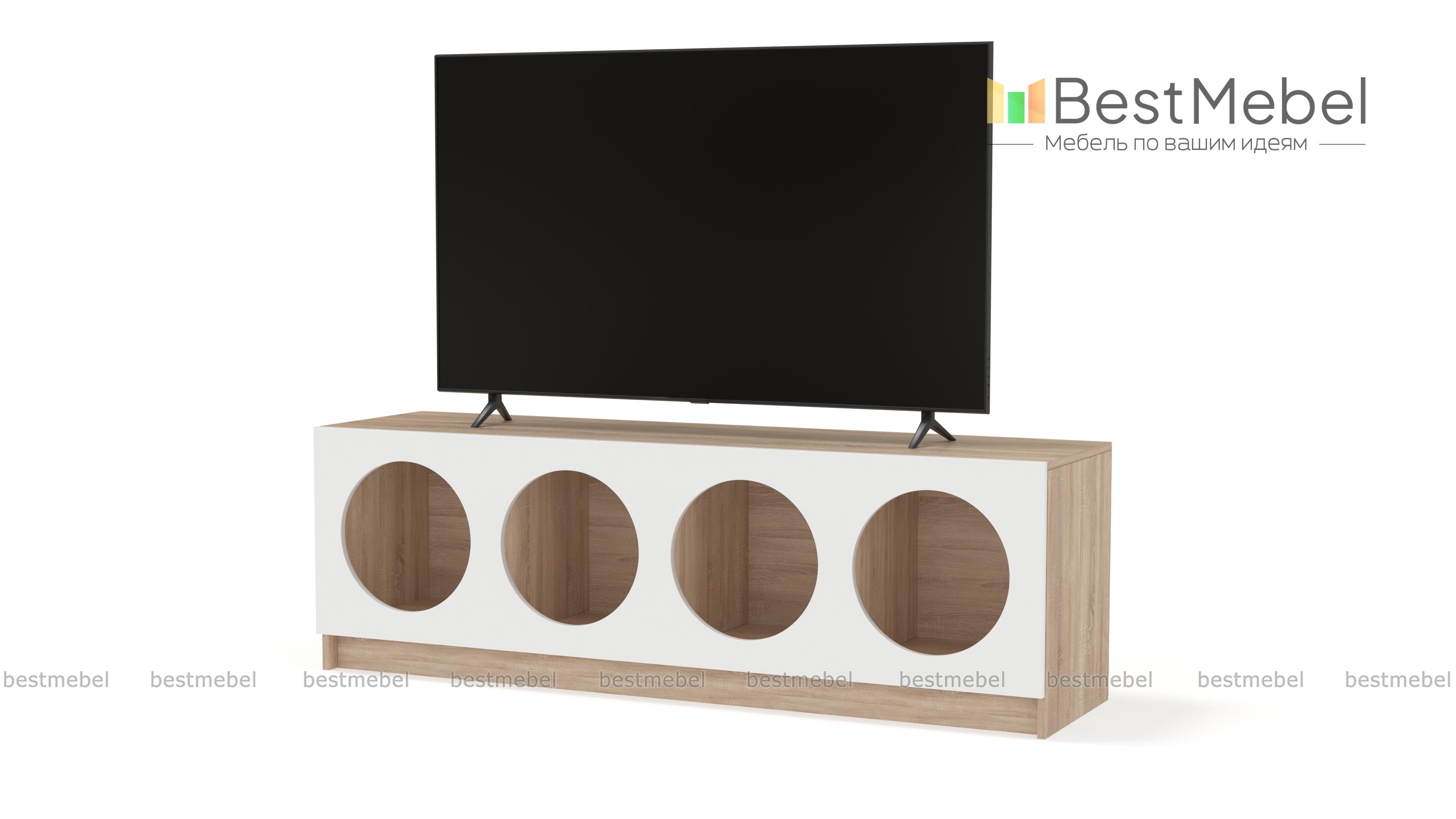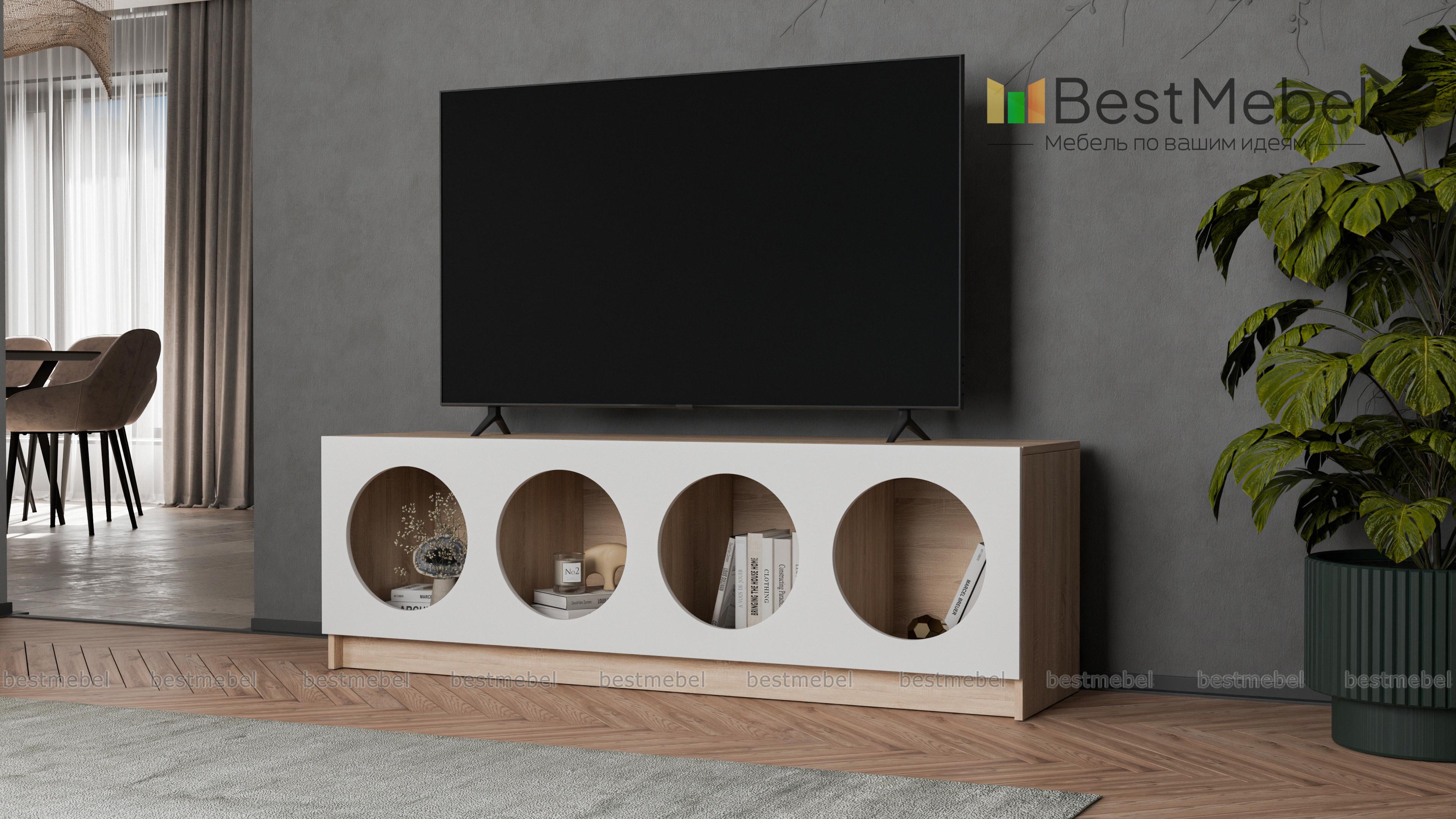 Тумба под ТВ Руди 7 BMS будет выполнять не только практическую, но и эстетическую функцию в интерьере. Четыре полки с большими круглыми вырезами станут прекрасным фоном для книг и журналов, пластинок или любимого декора. Корпус с широкой прочной столешницей под ТВ выполнен из ламинированной плиты древесного оттенка, фасад — контрастная, устойчивая к износу МДФ. Купить тумбу под ТВ Руди 7 BMS с выбором цветовой гаммы и нужного размера вы сможете в нашем интернет-магазине.