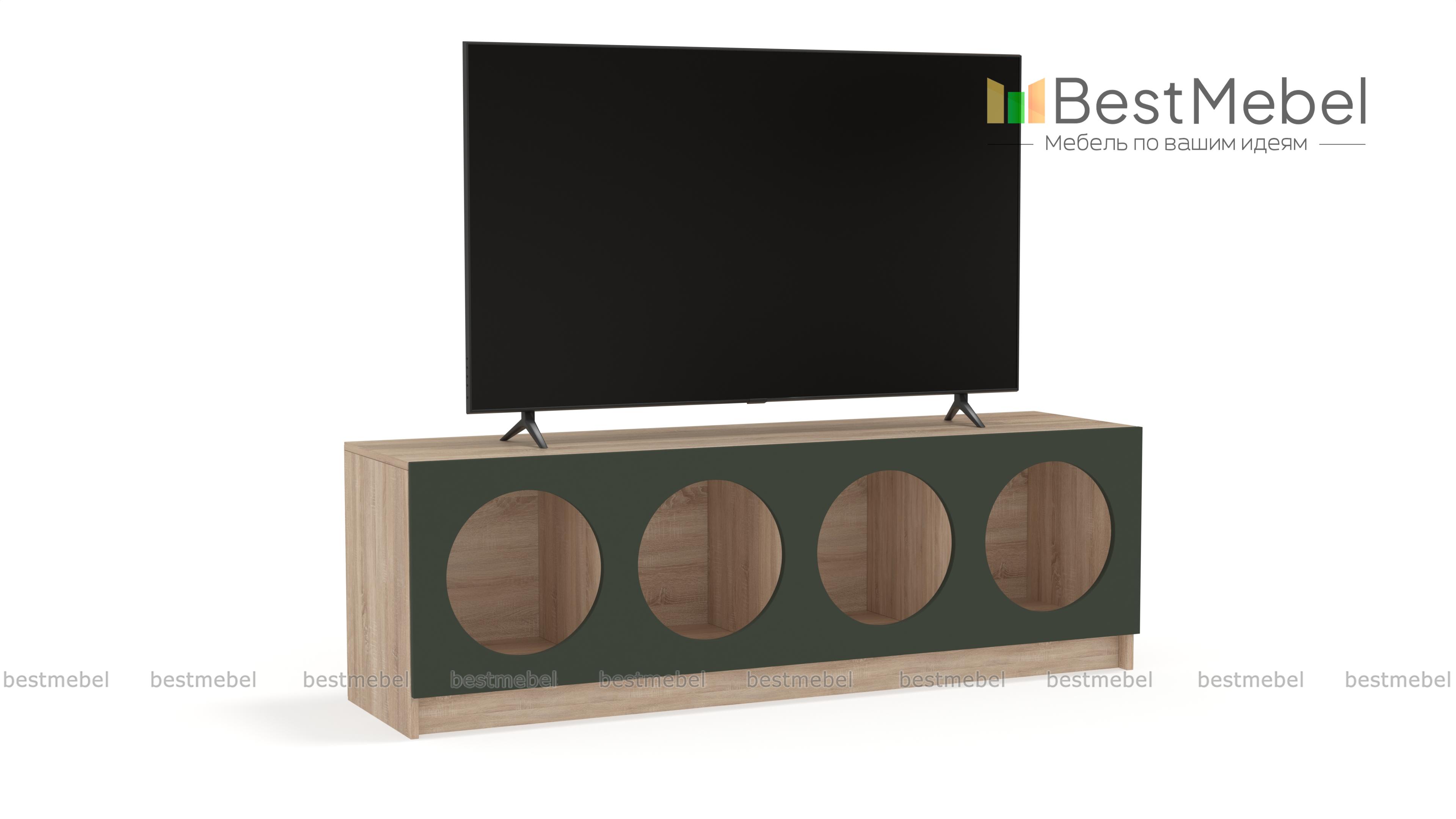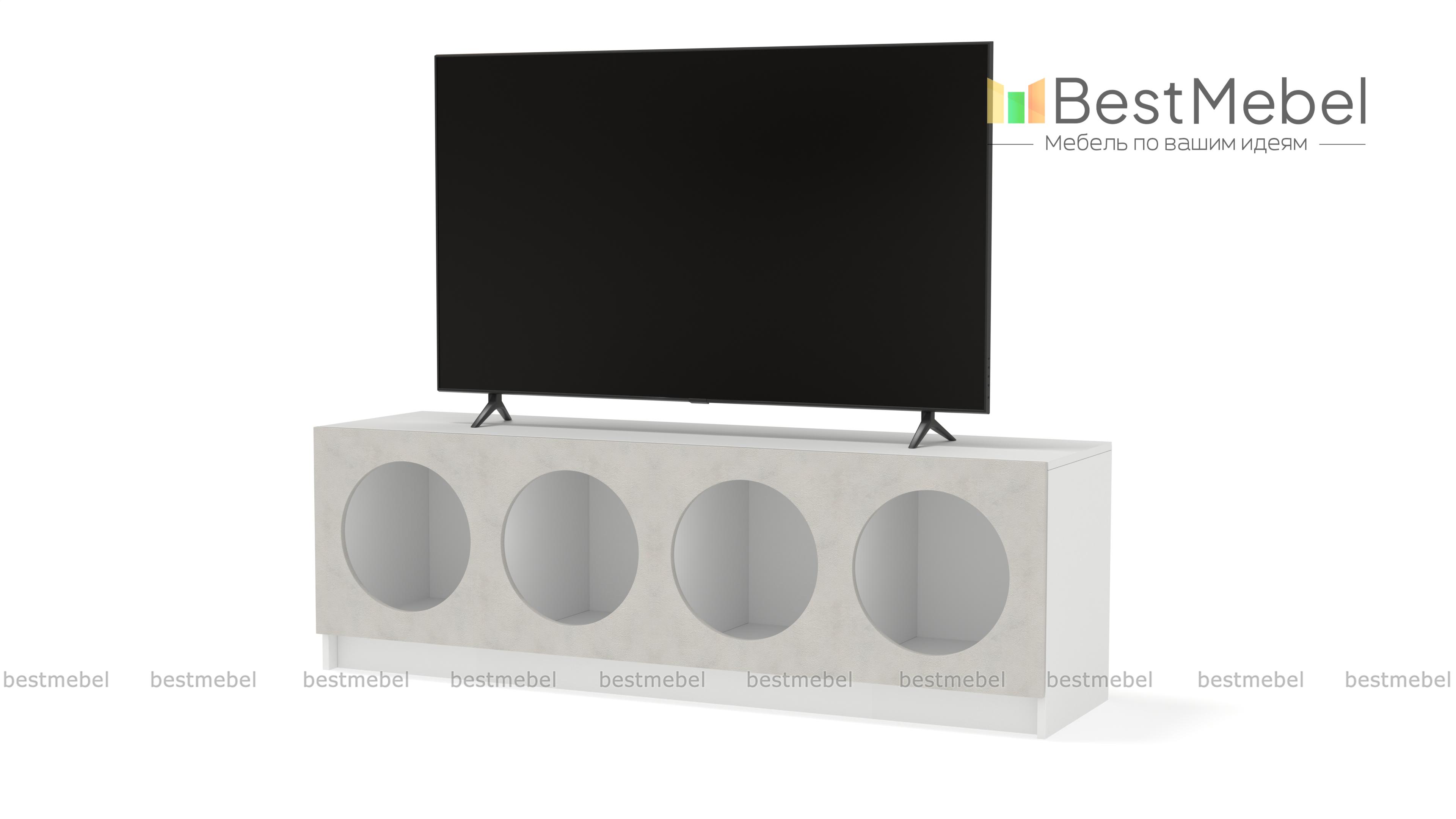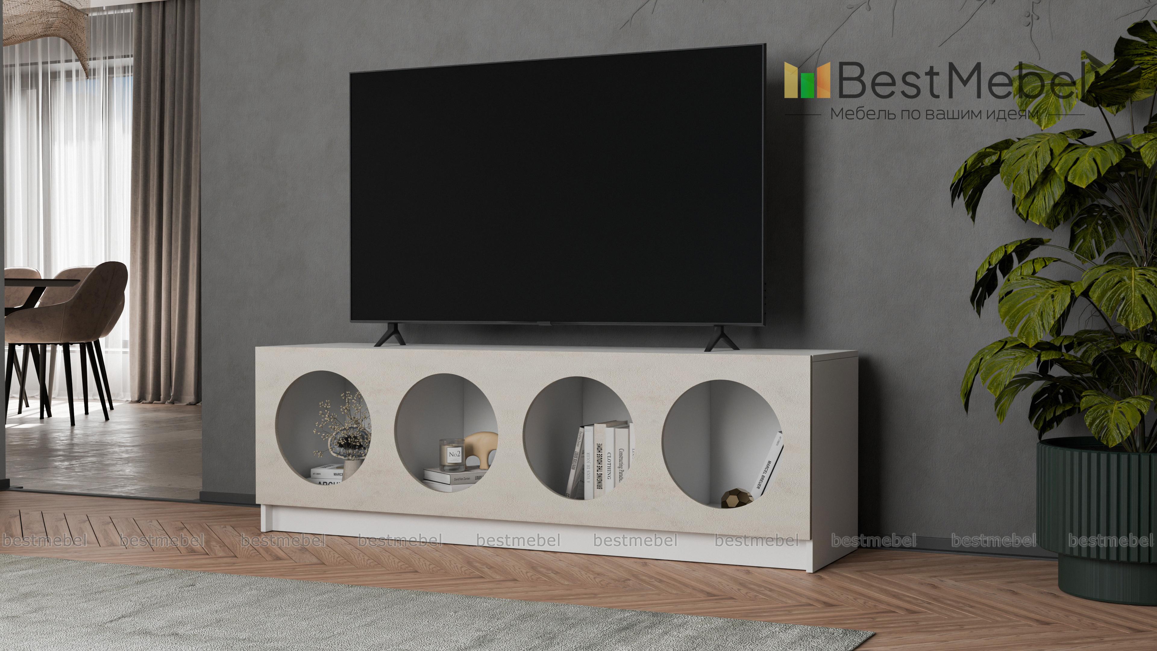Тумба под ТВ Руди 7 BMS будет выполнять не только практическую, но и эстетическую функцию в интерьере. Четыре полки с большими круглыми вырезами станут прекрасным фоном для книг и журналов, пластинок или любимого декора. Корпус с широкой прочной столешницей под ТВ выполнен из ламинированной плиты древесного оттенка, фасад — контрастная, устойчивая к износу МДФ. Купить тумбу под ТВ Руди 7 BMS с выбором цветовой гаммы и нужного размера вы сможете в нашем интернет-магазине.